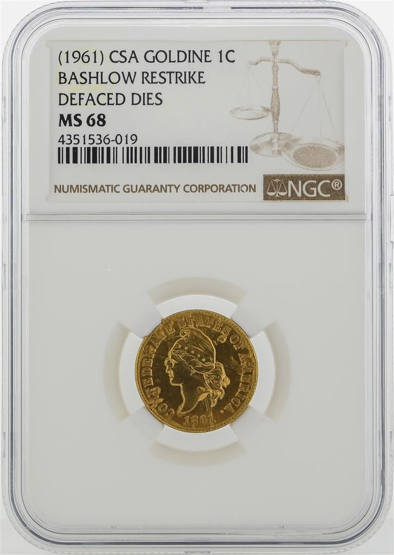 One 1961 CSA 1 Cent Goldine Coin Bashlow Restrike NGC MS68. NGC Certified.