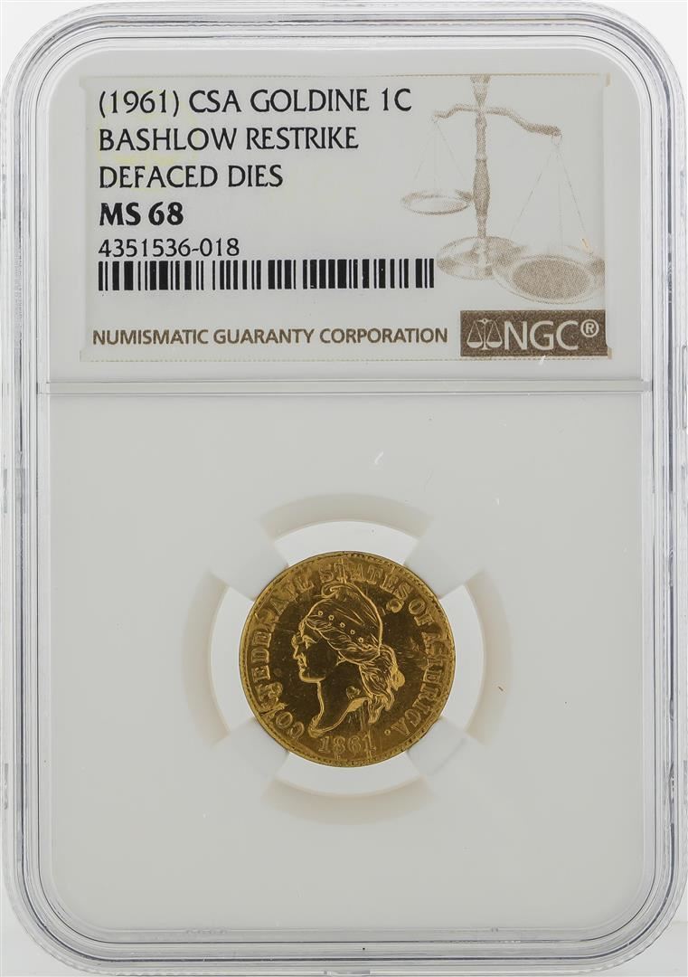 One 1961 CSA 1 Cent Goldine Coin Bashlow Restrike NGC MS68. NGC Certified.