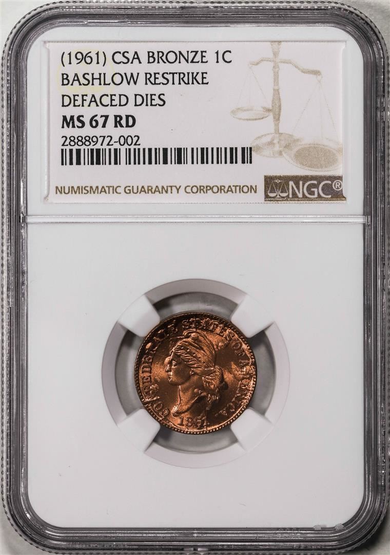 One 1961 Confederate States of America Bronze 1c Bashlow Restrike Defaced Dies NGC MS67 RD. NGC Certified.
