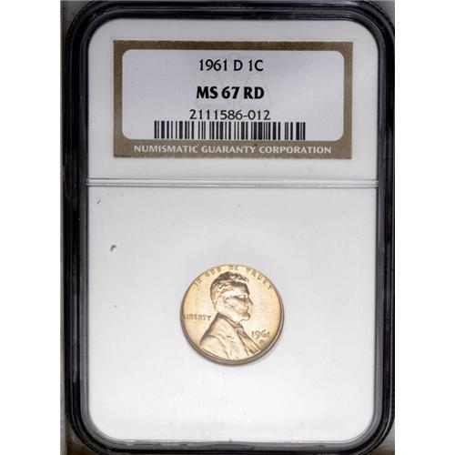 <B>1961-D<1C> MS67 Red NGC.</B></I> Unusually crisp striking details are noted on this bright, vibrantly lustrous example. The reverse is near-pristine, and the obverse reveals just a couple of tiny nicks on Lincoln's cheekbone. The exceedingly low population of this coin at the MS67 Red grade level should command the attention of Lincoln cent specialists. Only four pieces have been certified as such by NGC (with none finer), while PCGS has yet to see a single specimen better than MS66. Census: 4 in 67 Red, 0 finer (3/06). <BR><BR><B>Important notice:</B> Heritage usually auctions material at the rate of 200-250 lots per hour. On some occasions eBay Live bid software or the Internet may not be able to keep up with the pace of the auction. We recommend placing a realistic absentee bid now as insurance to avoid disappointment. Occasionally the auctioneer may eliminate or reject an eBay Live bid, and the auctioneer may also reopen a lot after the close of the eBay live bidding (usually because we missed an audience bid), and may reject your bid even if it shows you as the winning bidder. By bidding via eBay Live, you agree that Heritage may award the lot to another bidder at its sole discretion under the circumstances described above or any other reasonable circumstances. Since eBay bids are not shown to us until we open the lot on the floor, we treat those bids just like floor bids. In most cases the floor responds before the eBay bid is presented to us, due to Internet lag time, so for consistency we have made it a policy that floor bids are always considered first over tie eBay live bids. Also please note that all Heritage lots purchased through eBay Live carry a 20% Buyer's Premium. Please make sure you read the Terms and Conditions before you bid. This lot is being auctioned in conjunction with a live floor auction by Heritage Galleries & Auctioneers. All final auction and invoice information will be supplied by Heritage Galleries & Auctioneers, and all other information should be considered preliminary. Lot:685 <BR><BR><B>Winning Notification and Billing:</B> After the FINAL session in this auction is complete, Heritage will send e-mail and snail mail invoices. This process normally takes several days. All final auction and invoice information will be supplied by Heritage Galleries & Auctioneers, and all other information should be considered preliminary. <BR><BR>This auction will be conducted on a live auction floor and over the Internet through eBay Live. If you choose to place an absentee bid, please take a moment to <font color='#0000ff'><u><a href='http://pages.ebay.com/liveauctions/help/before/laabsentee.html'>learn how eBay Live absentee bidding works</a></u></font><font color='#000000'>