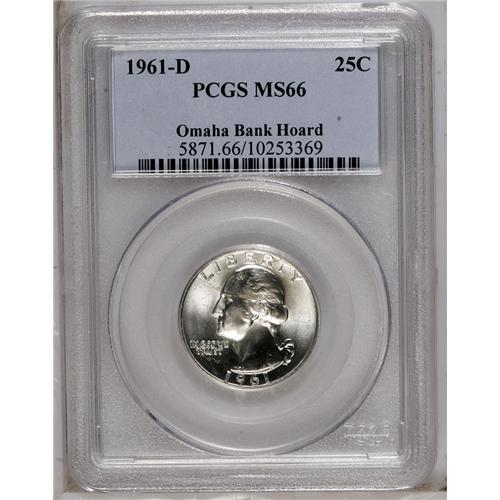 <B>1961-D 25C MS66 PCGS.</B></I> Ex: Omaha Bank Hoard. PCGS Population (162/1). NGC Census: (193/7). Mintage: 83,656,928. Numismedia Wsl. Price: $74. (#5871)<BR><BR><b>Shipping:</b> Coins & Currency (<a target="_blank" href="http://www.heritageauctions.com/common/shipping.php">view shipping information</a>)