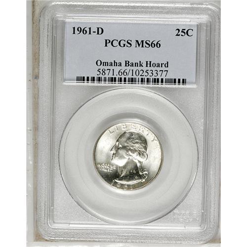 <B>1961-D 25C MS66 PCGS.</B></I> Ex:Omaha Bank Hoard. PCGS Population (162/1). NGC Census: (386/14). Mintage: 83,656,928. Numismedia Wsl. Price for NGC/PCGS coin in MS66: $74. (#5871)<BR><BR><b>Shipping:</b> Coins & Currency (<a target="_blank" href="http://www.heritageauctions.com/common/shipping.php">view shipping information</a>)