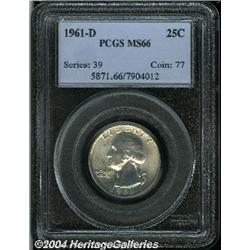 <B>1961-D<25C> MS66 PCGS.</B></I> This flashy D-mint quarter is sharply struck, and shows just a few isolated touches of faint gold color. There are no mentionable marks to report.<BR><I>From The Rafael Romero Collection.</B></I> <BR><BR><B>Important notice:</B> Heritage usually auctions material at the rate of 200-250 lots per hour. On some occasions eBay Live bid software or the Internet may not be able to keep up with the pace of the auction. We recommend placing a realistic absentee bid now as insurance to avoid disappointment. Occasionally the auctioneer may eliminate or reject an eBay Live bid, and the auctioneer may also reopen a lot after the close of the eBay live bidding (usually because we missed an audience bid), and may reject your bid even if it shows you as the winning bidder. By bidding via eBay Live, you agree that Heritage may award the lot to another bidder at its sole discretion under the circumstances described above or any other reasonable circumstances. Since eBay bids are not shown to us until we open the lot on the floor, we treat those bids just like floor bids. In most cases the floor responds before the eBay bid is presented to us, due to Internet lag time, so for consistency we have made it a policy that floor bids are always considered first over tie eBay live bids. Also please note that all Heritage lots purchased through eBay Live carry a 20% Buyer's Premium. Please make sure you read the Terms and Conditions before you bid.