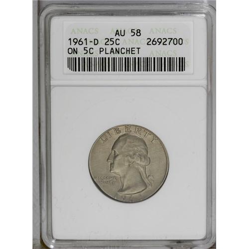 <B>1961-D<25C> Washington Quarter--Struck on a Five Cents Planchet--AU58 ANACS.</B></I> Streaky tan and olive-gray toning drapes this gently shimmering and nicely struck wrong planchet error. Uncentered toward 7 o'clock with UNITED STATES partly off the piece. The date is intact but distorted; the mintmark is bold. <BR><BR><B>Important notice:</B> Heritage usually auctions material at the rate of 200-250 lots per hour. On some occasions eBay Live bid software or the Internet may not be able to keep up with the pace of the auction. We recommend placing a realistic absentee bid now as insurance to avoid disappointment. Occasionally the auctioneer may eliminate or reject an eBay Live bid, and the auctioneer may also reopen a lot after the close of the eBay live bidding (usually because we missed an audience bid), and may reject your bid even if it shows you as the winning bidder. By bidding via eBay Live, you agree that Heritage may award the lot to another bidder at its sole discretion under the circumstances described above or any other reasonable circumstances. Since eBay bids are not shown to us until we open the lot on the floor, we treat those bids just like floor bids. In most cases the floor responds before the eBay bid is presented to us, due to Internet lag time, so for consistency we have made it a policy that floor bids are always considered first over tie eBay live bids. Also please note that all Heritage lots purchased through eBay Live carry a 20% Buyer's Premium. Please make sure you read the Terms and Conditions before you bid. This lot is being auctioned in conjunction with a live floor auction by Heritage Galleries & Auctioneers. All final auction and invoice information will be supplied by Heritage Galleries & Auctioneers, and all other information should be considered preliminary. Lot:5332 <BR><BR><B>Winning Notification and Billing:</B> After the FINAL session in this auction is complete, Heritage will send e-mail and snail mail invoices. This process normally takes several days. All final auction and invoice information will be supplied by Heritage Galleries & Auctioneers, and all other information should be considered preliminary. <BR><BR>This auction will be conducted on a live auction floor and over the Internet through eBay Live. If you choose to place an absentee bid, please take a moment to <font color='#0000ff'><u><a href='http://pages.ebay.com/liveauctions/help/before/laabsentee.html'>learn how eBay Live absentee bidding works</a></u></font><font color='#000000'>