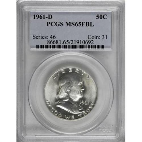 <B>1961-D 50C MS65 Full Bell Lines PCGS.</B></I> PCGS Population (242/11). NGC Census: (46/2). Numismedia Wsl. Price for NGC/PCGS coin in MS65: $480. (#86681)<BR><BR><b>Shipping:</b> Coins & Currency (<a target="_blank" href="http://www.heritageauctions.com/common/shipping.php">view shipping information</a>)