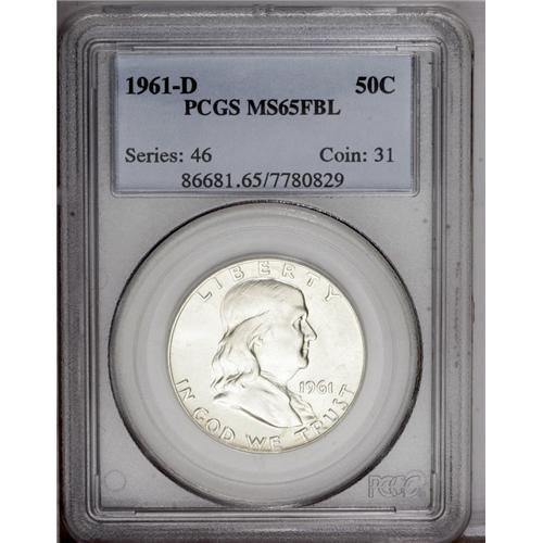 <B>1961-D<50C> MS65 Full Bell Lines PCGS.</B></I> Fully brilliant and highly lustrous with sharp design features. The bell lines are full, although crossed by a few light bagmarks. Few finer examples of this date have been certified with the FBL designation. Population: 232 in 65, 8 finer (1/06).