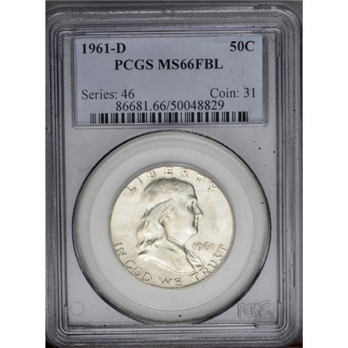 <B>1961-D<50C> MS66 FBL PCGS.</B></I> "A near-mark-free MS66, with well struck, full bell line surfaces, is a highly desirable coin, and highly recommended at current levels - if you can fine one!" Those were the words of Rick Tomaska in <I>The Complete Guide to Franklin Half Dollars,</B></I> published in 2002. While market levels have changed in the past couple years, the comments regarding rarity of this issue hold true today. This bright Gem has satiny luster with lovely silver surfaces and just a few minor splashes of milky toning. Population: 8 in 66, none are finer (3/06).<BR><I>From The Alex & Nan Registry Sets.</B></I> <BR><BR><B>Important notice:</B> Heritage usually auctions material at the rate of 200-250 lots per hour. On some occasions eBay Live bid software or the Internet may not be able to keep up with the pace of the auction. We recommend placing a realistic absentee bid now as insurance to avoid disappointment. Occasionally the auctioneer may eliminate or reject an eBay Live bid, and the auctioneer may also reopen a lot after the close of the eBay live bidding (usually because we missed an audience bid), and may reject your bid even if it shows you as the winning bidder. By bidding via eBay Live, you agree that Heritage may award the lot to another bidder at its sole discretion under the circumstances described above or any other reasonable circumstances. Since eBay bids are not shown to us until we open the lot on the floor, we treat those bids just like floor bids. In most cases the floor responds before the eBay bid is presented to us, due to Internet lag time, so for consistency we have made it a policy that floor bids are always considered first over tie eBay live bids. Also please note that all Heritage lots purchased through eBay Live carry a 20% Buyer's Premium. Please make sure you read the Terms and Conditions before you bid. This lot is being auctioned in conjunction with a live floor auction by Heritage Galleries & Auctioneers. All final auction and invoice information will be supplied by Heritage Galleries & Auctioneers, and all other information should be considered preliminary. Lot:3130 <BR><BR><B>Winning Notification and Billing:</B> After the FINAL session in this auction is complete, Heritage will send e-mail and snail mail invoices. This process normally takes several days. All final auction and invoice information will be supplied by Heritage Galleries & Auctioneers, and all other information should be considered preliminary. <BR><BR>This auction will be conducted on a live auction floor and over the Internet through eBay Live. If you choose to place an absentee bid, please take a moment to <font color='#0000ff'><u><a href='http://pages.ebay.com/liveauctions/help/before/laabsentee.html'>learn how eBay Live absentee bidding works</a></u></font><font color='#000000'>
