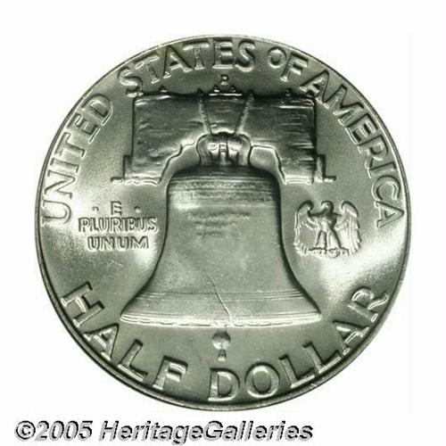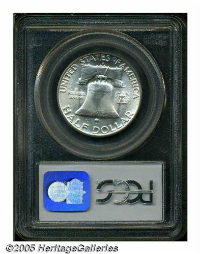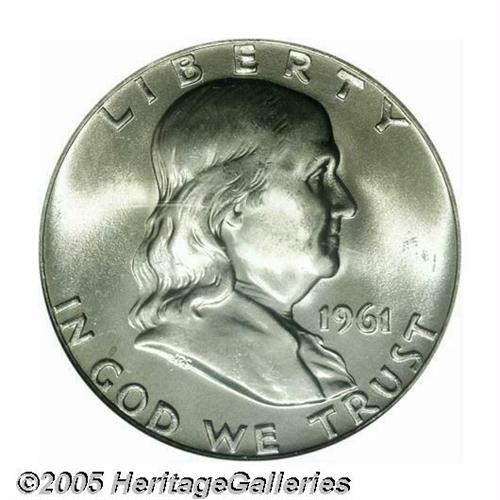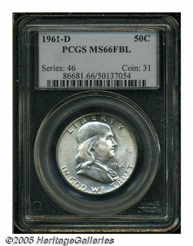 <B>1961-D<50C> MS66 Full Bell Lines PCGS.</B></I> Like so many of the Franklins in this sale, this example is tied with a few others for honors as the finest FBL example certified by PCGS. Despite substantial mintages, FBL examples of the Franklin half dollars dated in the 1960s are seldom seen. These coins were subjected to a variety of different conditions, from weak strikes within the mint to bagmarks and poor handling outside the mint. The chances of any surviving in this condition were slim. This example is a fully brilliant Gem with satiny snow white surfaces and sharp design elements. Population: 7 in 66, 0 finer (5/05).