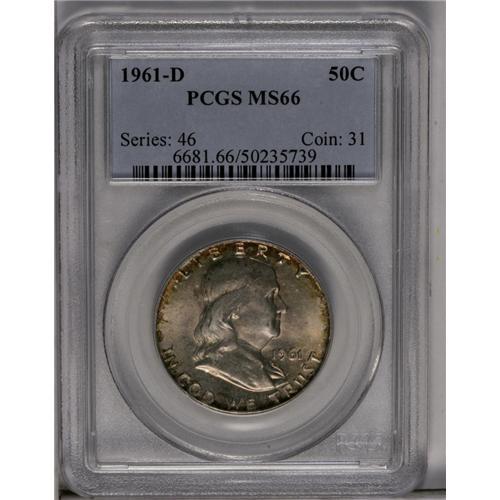 <B>1961-D<50C> MS66 PCGS.</B></I> A deeply toned Gem with predominant golden-brown color, accented by peripheral iridescence. A splendid Gem example despite a few tiny surface ticks. No finer examples have been certified. Population: 15 in 66, 0 finer (5/06).