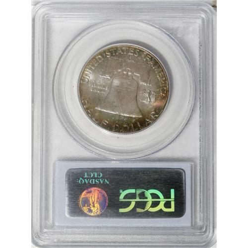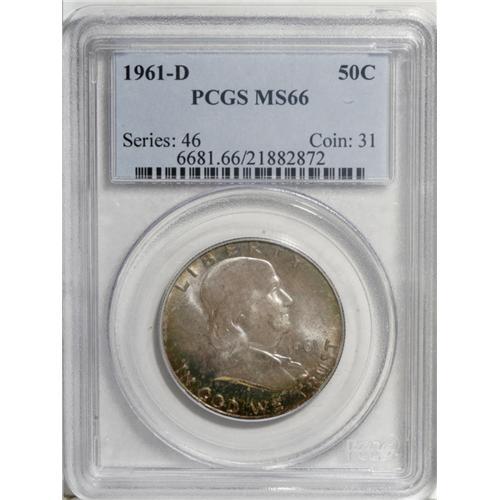 <B>1961-D 50C MS66 PCGS.</B></I> Gorgeously toned with dove-gray centers and orange, ruby, and sea-green peripheries. Prior to 1959, Mint Sets were issued in high-sulfur content cardboard holders resulting in occasional exceptionally attractive, deeply toned examples. In 1959, the Mint switched to plastic wrappers that prevented toning. The later date Franklins with toning as found here are highly unusual and quite desirable.<BR><I>From The Southern Collection.</B></I><BR><BR><b>Shipping:</b> Coins & Currency (<a target="_blank" href="http://www.heritageauctions.com/common/shipping.php">view shipping information</a>)