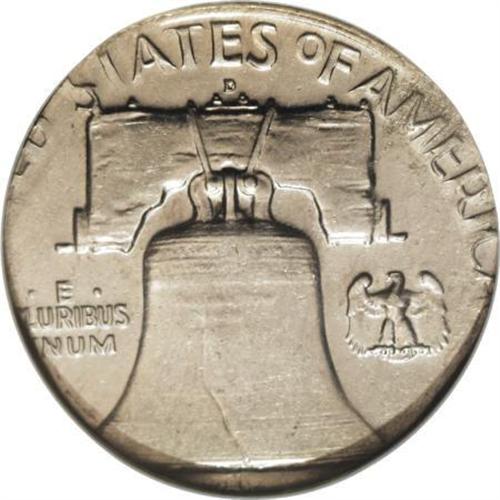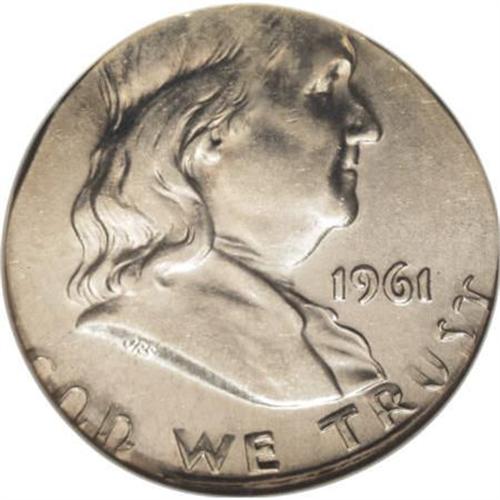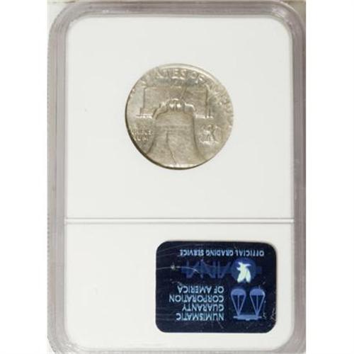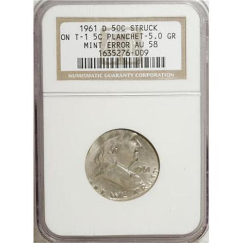 <B>1961-D 50C Franklin Half--Struck on a Type One Five Cent Planchet--AU58 NGC.</B></I> 5.0 gm. This Franklin half was struck on a Jefferson nickel planchet that never made it through the upset mill, thus the rim of the planchet remained flat. Due to the undersized flan relative to the dies, LIBERTY and HALF DOLLAR are absent, but the date and mintmark are present. Wrong planchet errors on Franklin halves are very scarce.<BR><BR><B>Coin Engraver:</B> John R. Sinnock<BR><BR><b>Shipping:</b> Coins & Currency (<a target="_blank" href="http://www.heritageauctions.com/common/shipping.php">view shipping information</a>)