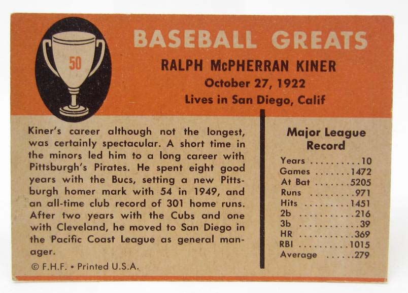 1961 FLEER RALPH KINER #50 BASEBALL CARD