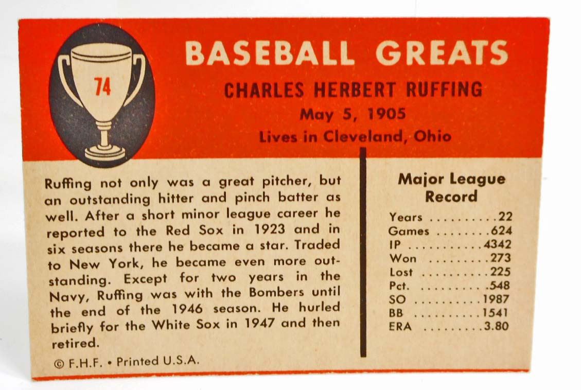 1961 FLEER RED RUFING #74 BASEBALL CARD