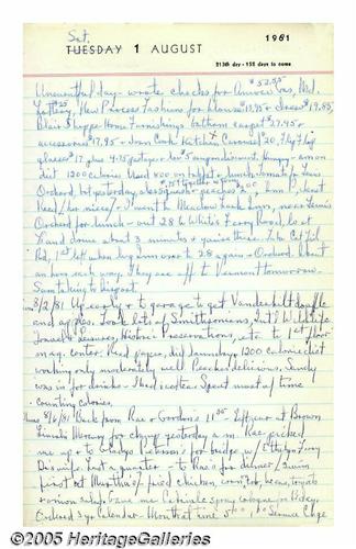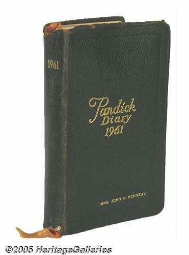 <B>1961 First Lady Jackie Kennedy Diary</B></I> Toi Bachelder served Presidents Franklin Roosevelt through Lyndon Johnson during her thirty-four year career at the White House. Her mother, Mable Bachelder, worked as a Correspondence Reviewer at the White House as well from 1936 until 1951. This 1961 black leather diary was owned by First Lady Jackie Kennedy and her name is so imprinted on the front cover. Two engraved White House cards written and signed in Bachelder's hand recount the provenance of the diary and reflect her personal anecdotes from her time in Washington, D.C. <I>Accompanied by COA from PSA/DNA.</B></I> Lot:255