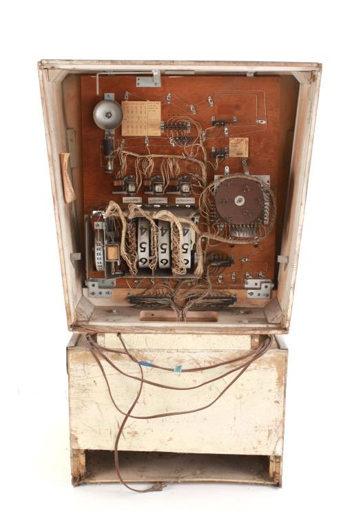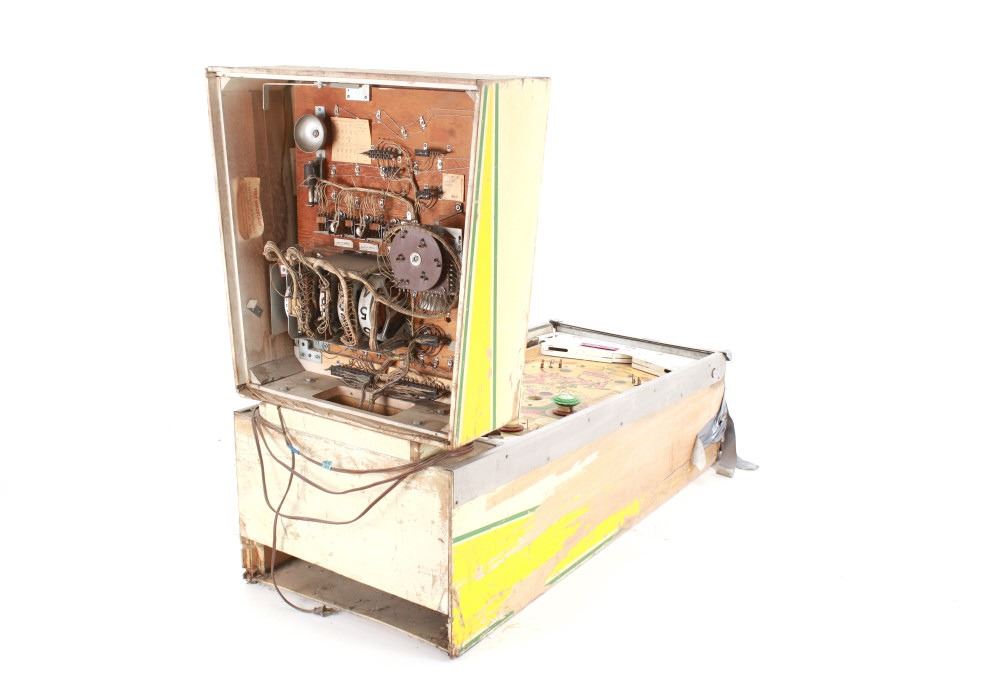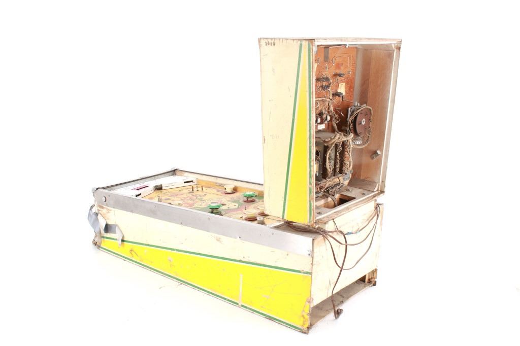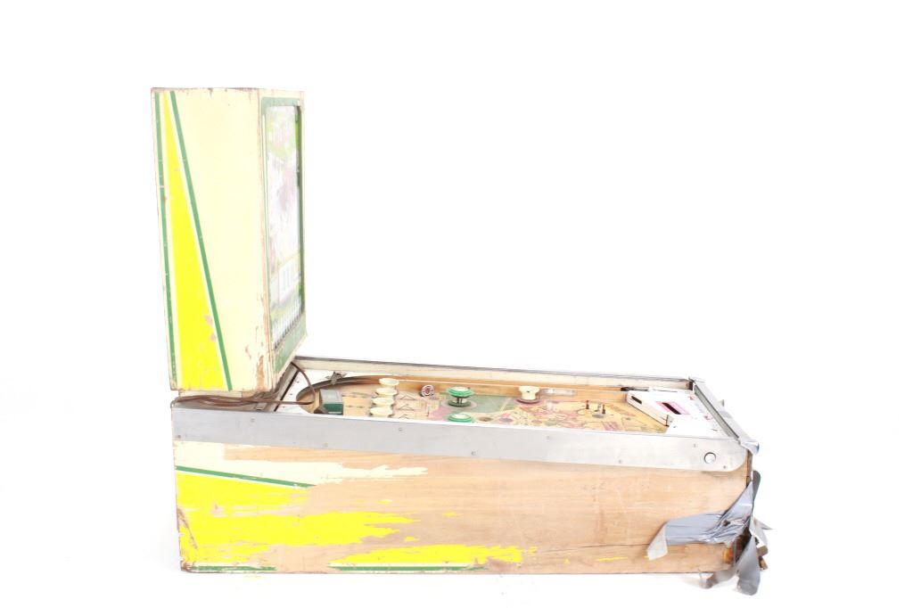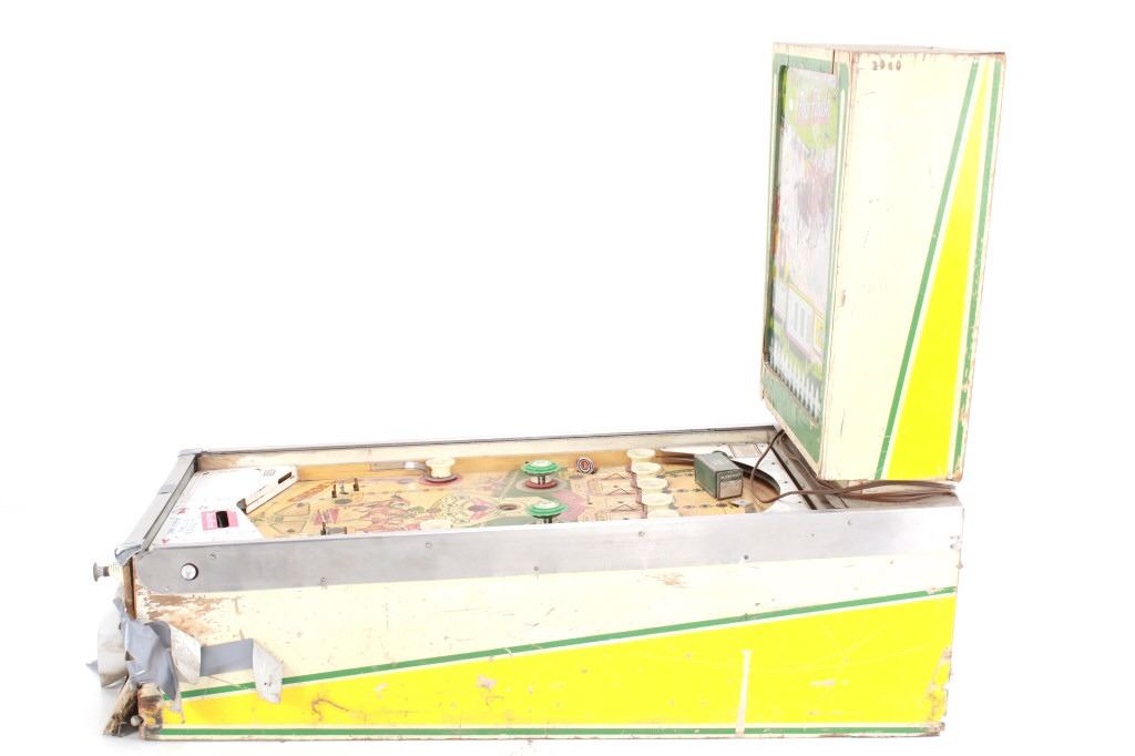 The machine shows colors of green, beige, tan, brown, yellow, blue and red throughout. The machine shows fair condition as it is missing the playing field glass, the leg stands and more. The front and sides are taped to hold things together. The electrical and internal components show wear and tear from its vintage age and years of use showing cut and broken wires. The machine has not been tested for functionality. The machine measures 54 1/4" L x 26" W x 43 1/4" H.