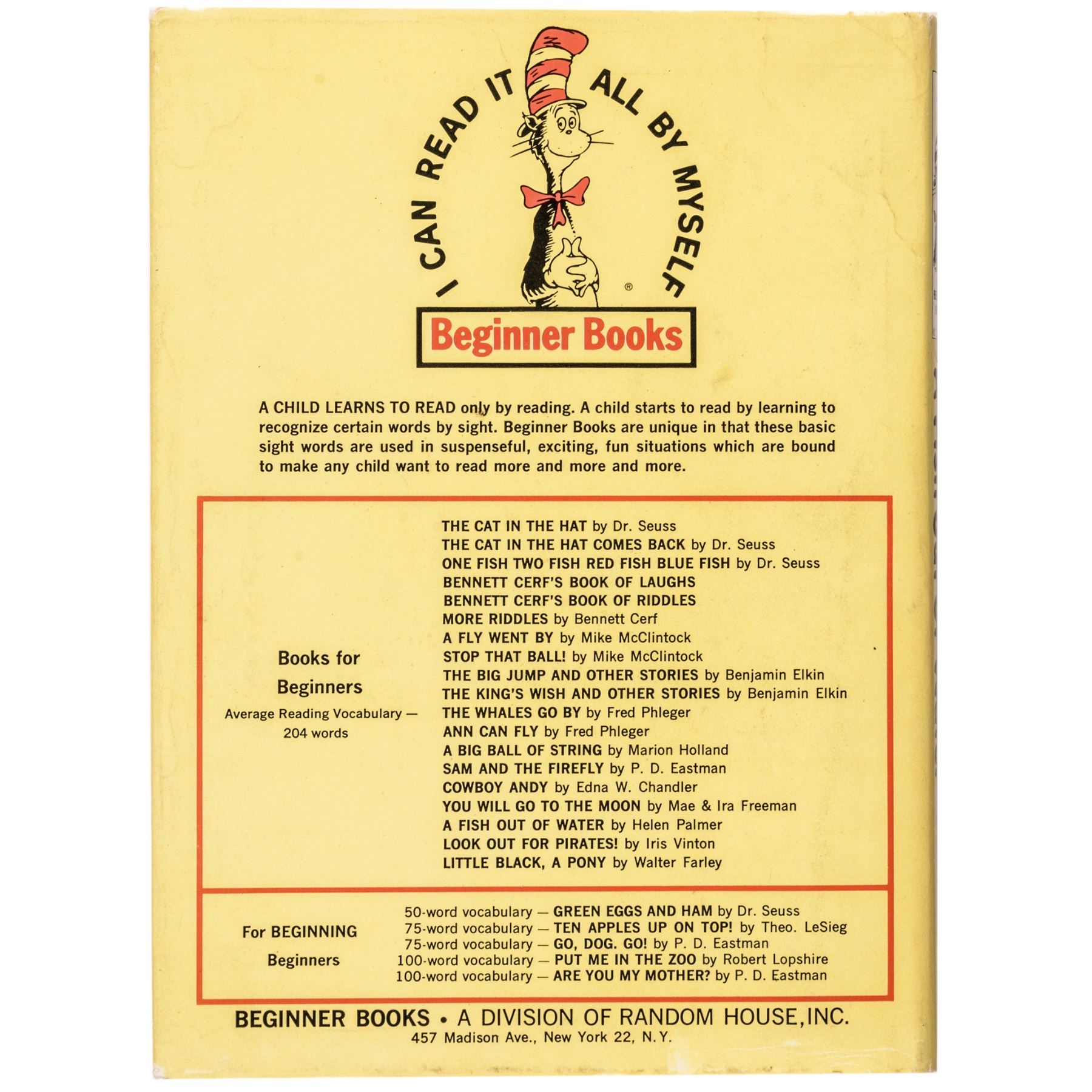 The book is in fine condition, with the mildest of wear to edges being the only potential defect. Clean and glossy on the outside, unmarked on the inside. The dust jacket is just about as fine. It's an original, as evinced by the 195/195 on the front flap, and the fact that "A Fish Out of Water" appears third from the bottom on the back cover's beginner books list.