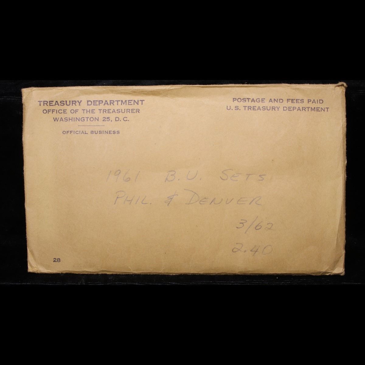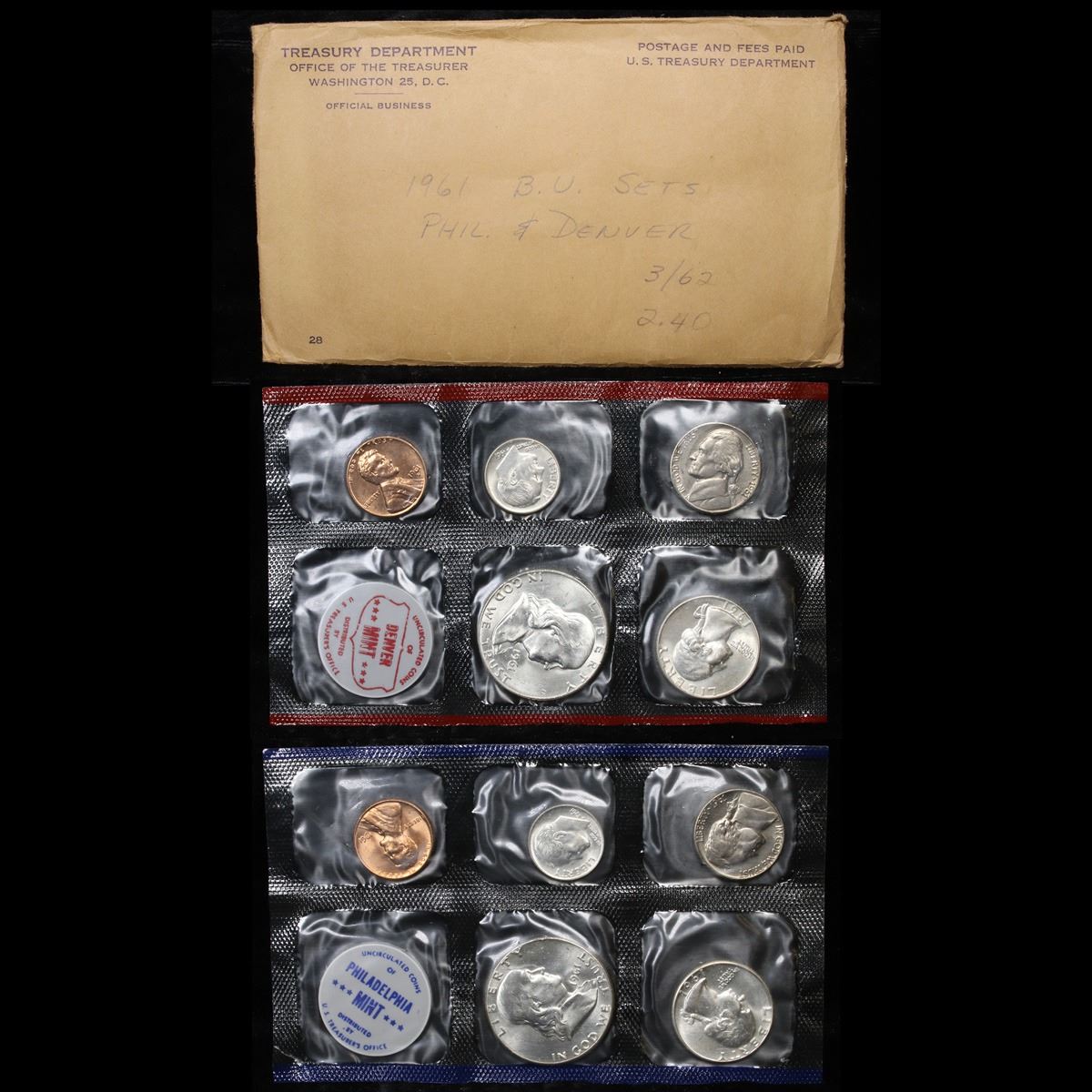 1961 Mint Set In Original Government packaging, includes 10 coins. This is a beautiful 1961 Double silver mint set and includes 2 of each coin minted for 1961. This lot includes 10 coins, the full p, and d runs. The set has: 2 Franklin halves, 2 Washington quarters, 2 Roosevelt Dimes, 2 Jefferson nickels and 2 lincoln cents.