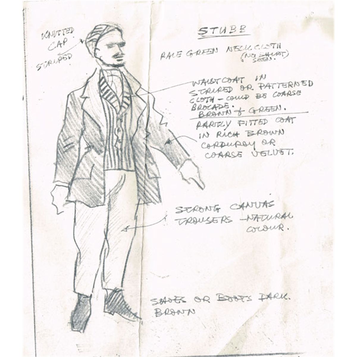 Original working copy of sketched costume designs for the characters Ahab, Peleg, Stubb, Flask, Elijah and other general notes about problems and recommendations for the costumes. Signed on the reverse by producer Jack Aranson. Contained in an original folder with hand written details relating to costumes , meetings etc. Alpho O'Reilly, the well known designer was the Head of Design for RTE. He went missing in 1996 and has never been seen since.