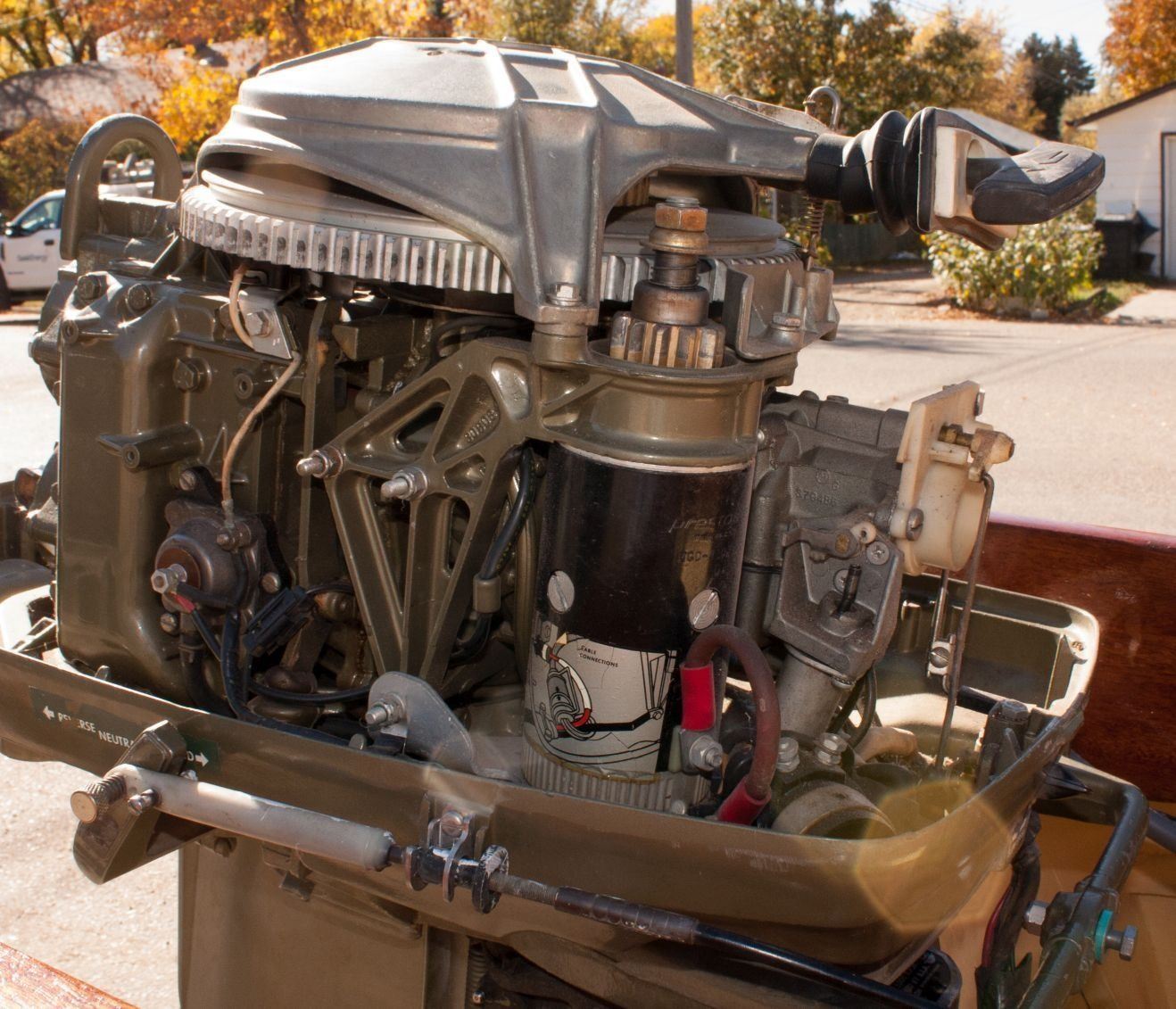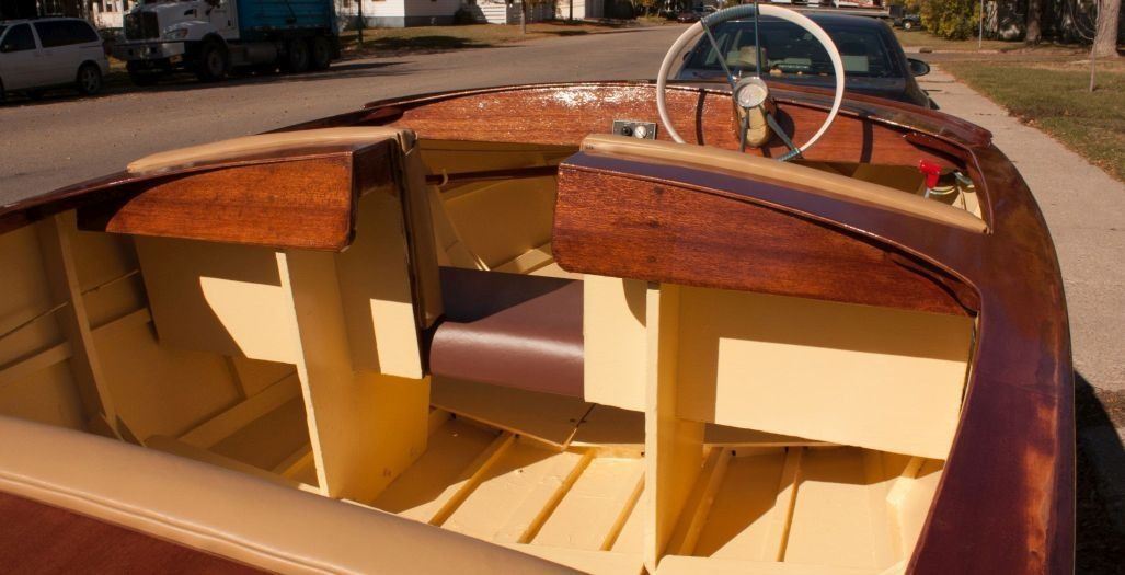 Restored with new ribbon mahogany plywood deck all brass nails and epoxy glue. Old Master Spar Marine urethane varnish finish in high gloss finish. Electric start 40 horsepower Johnson Seahorse outboard motor. Motor has been checked over by Pally Performance Saskatoon 3 weeks ago. All new marine grade vinyl upholstery with high density foam on seats and seatbacks.