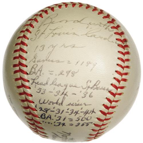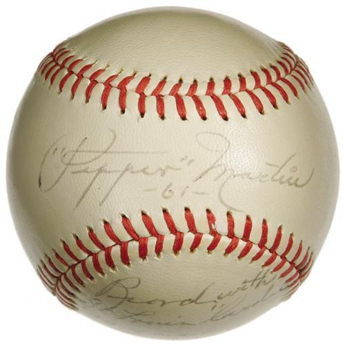 <B>1961 Pepper Martin Single Signed "Stat" Baseball.</B></I> Another very scarce single that's almost assuredly unique in this incredible format. A fine 8/10 black ink sweet spot signature, dated "61," is augmented with a thrilling and lengthy side panel of prose regarding Martin's Cardinals service. Condition, almost an afterthought here, is likewise exceptional, and the ONL (Giles) ball is clean and white. A top-tier Cardinals artifact. <I>LOA from PSA/DNA. LOA from James Spence Authentication.</B></I><BR><BR><b>Shipping:</b> Balls, etc. (<a target="_blank" href="http://www.heritageauctions.com/common/shipping.php">view shipping information</a>)