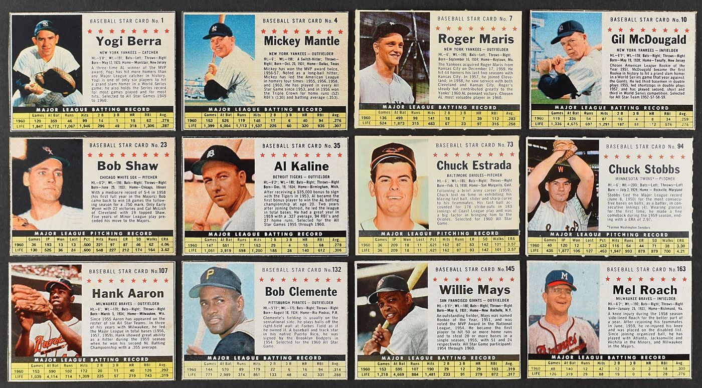 The first of the three 200 card Post cereal sets, with all the top players of the day. Includes: complete set of 200 cards with #1 Berra (EX), 4 Mantle (VG/EX), 7 Maris (VG/EX), 10 Gil McDougald (VG/EX), 23 Bob Shaw (EX), 35 Kaline (EX), 70 Gene Woodling (EX/MT), 73 Chuck Estrada (EX), 75 B. Robinson (EX/MT), 94 Chuck Stobbs (VG), 107 Aaron (VG/EX), 113 Chuck Cottier (VG), 132 Clemente (EX/MT), 135 Bill Virdon (VG/EX), 145 Mays (VG/EX), 147 McCovey (VG), 163 Mel Roach (EX), 167 Snider (EX), 182 F. Robinson (VG) and 183 Roy McMillan (EX). Grades mostly VG to EX/MT, some better - a few lesser.