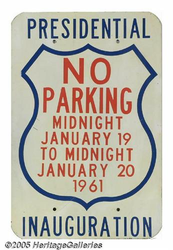 <B>1961 Presidential Inauguration Metal Parking Sign</B></I> This sign for John F. Kennedy's inauguration measures 17 1/2" by just less than 12". It has a couple of minor scrapes, but is in quite good order as it would have been hung on the street and survived a large snow storm that hit Washington D.C. just before the event. Lot:264