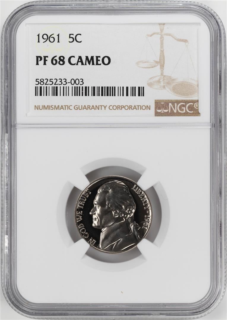 One 1961 Proof Jefferson Nickel Coin NGC PF68 Cameo. NGC Certified.