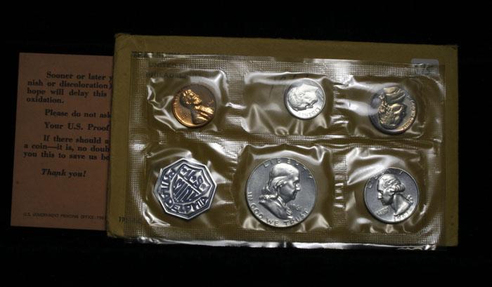 This Set may have a Cameo Roosevelt Dime, Look at the pictures yourself. It is hard to tell in the Cellophane and I am not sure. The set, has a 90% Proof Silver Franklin Half Dollar, a 90% Proof Silver Quarter, a 90% Silver Dime, 2 Other Proof Coins, all in the Original Packaging including The Mint "Memo". Estimated Value $50