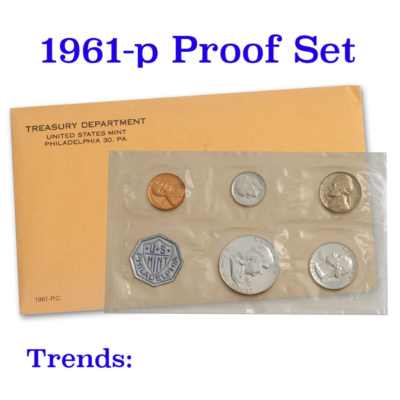 1961 Proof Set in the Original Packaging including mint memo . This set contains a 90% Proof Silver Franklin Half Dollar, a 90% Proof Silver Quarter, a 90% Proof Silver Dime + the proof nickel and proof penny. All 5 coins grade PR65+ or better. This proof set is 50 years old! In the envelope, but does not have the mint memo. Estimated Value $60 for PR63. Estimated Value $80.