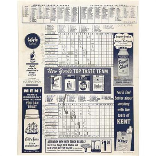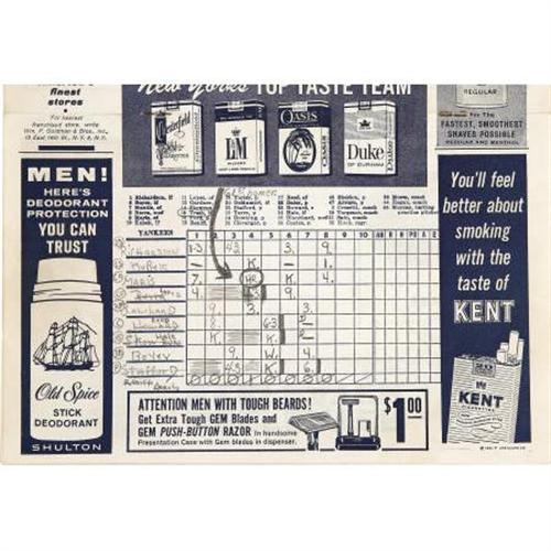 <B>1961 Roger Maris Sixty-First Home Run Program.</B></I> "Fastball hit deep to right. This could be it! Way back there! Holy cow! He did it! Sixty-one for Maris! Look at 'em fight for that ball out there!" Though the famous call of radio announcer and fellow Yankee great Phil Rizzuto is remembered by millions today, only 23,154 fans were actually on hand to witness the historic event first hand in the Bronx. With the Yankees clinching the pennant almost two weeks earlier, attendance for this 162nd and final game of the 1961 season was particularly light, resulting in a correspondingly thin supply of artifacts from that game today. Here we present one of the few available programs purchased and scored by a lucky spectator on October 1st, 1961, with Maris' fourth inning home run circled and notated as the record-breaker. The program shows a mild degree of external wear but no damage, and remains solidly bound. This is one of the toughest post-war programs in the hobby, so any opportunity to own one should be taken very seriously.<BR><BR><b>Shipping:</b> Flat Material, Large (<a target="_blank" href="http://www.heritageauctions.com/common/shipping.php">view shipping information</a>)