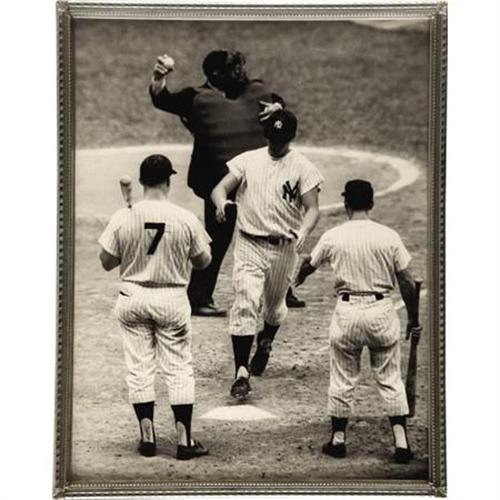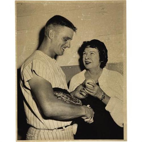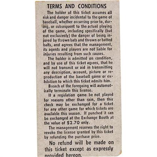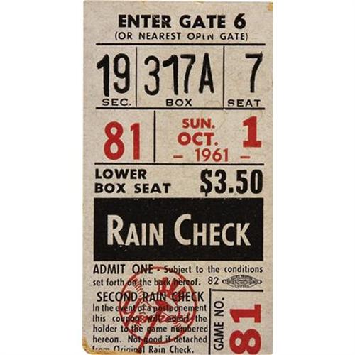 <B>1961 Roger Maris Sixty-First Home Run Ticket Stub.</B></I> When ranking the most memorable moments in post-war baseball history in terms of fan attendance, the game that saw Roger Maris supplant the Babe at the top of single season home run ladder rates right at the bottom. The 1961 Yanks had wrapped up the American League pennant eleven days earlier, shaving the crowd for the final regular season game to just 23,154. So it's little wonder that stubs such as this rarely surface within the hobby, nor is it a surprise that bidding for the few available specimens is uniformly spirited. Short of typical edge and corner wear, this modest little stub presents marvelously, with no creases, tears or stains to note. Included in the lot are two oversized (approximately 11x14") vintage photos taken of Maris that season, one crossing home plate after one of his many long balls, and the other posing with the widow of Babe Ruth and the sixtieth home run baseball. Photos are EX or better.<BR><BR><b>Shipping:</b> Flat Material, Large (<a target="_blank" href="http://www.heritageauctions.com/common/shipping.php">view shipping information</a>)