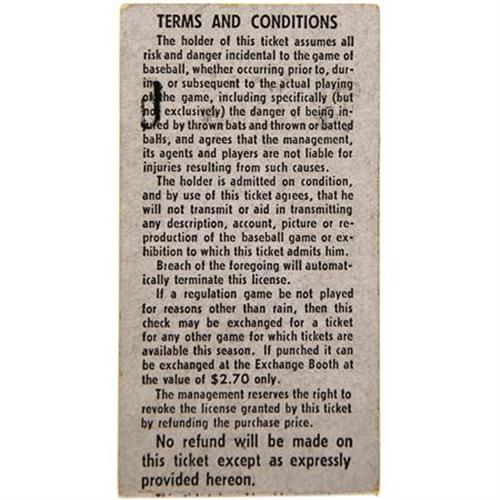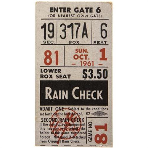 <B>1961 Roger Maris Sixty-First Home Run Ticket Stub.</B></I> This 1.5x3" slab of paper represents one of the most inspiring moments in our National Pastime, as a quiet and humble midwestern boy secured his place in history during the game it recalls. The final match of a Yankee season that saw Maris excoriated by the press and booed by his own fans was attended by just over 23,000 fans, leaving the Bronx ballpark more than half empty for that heroic moment. As such, only a handful of tickets from the game exist today, and just a scant few could possibly match the NRMT condition of the offered specimen. Included in the lot is a fantastic 11x14" print capturing the moment of impact, with Maris' number "9" clearly visible in the batter's box and the sparsely populated outfield bleachers in the distance. Mat and frame them together for an impressive display.<BR><BR><b>Shipping:</b> Flat Material, Large (<a target="_blank" href="http://www.heritageauctions.com/common/shipping.php">view shipping information</a>)