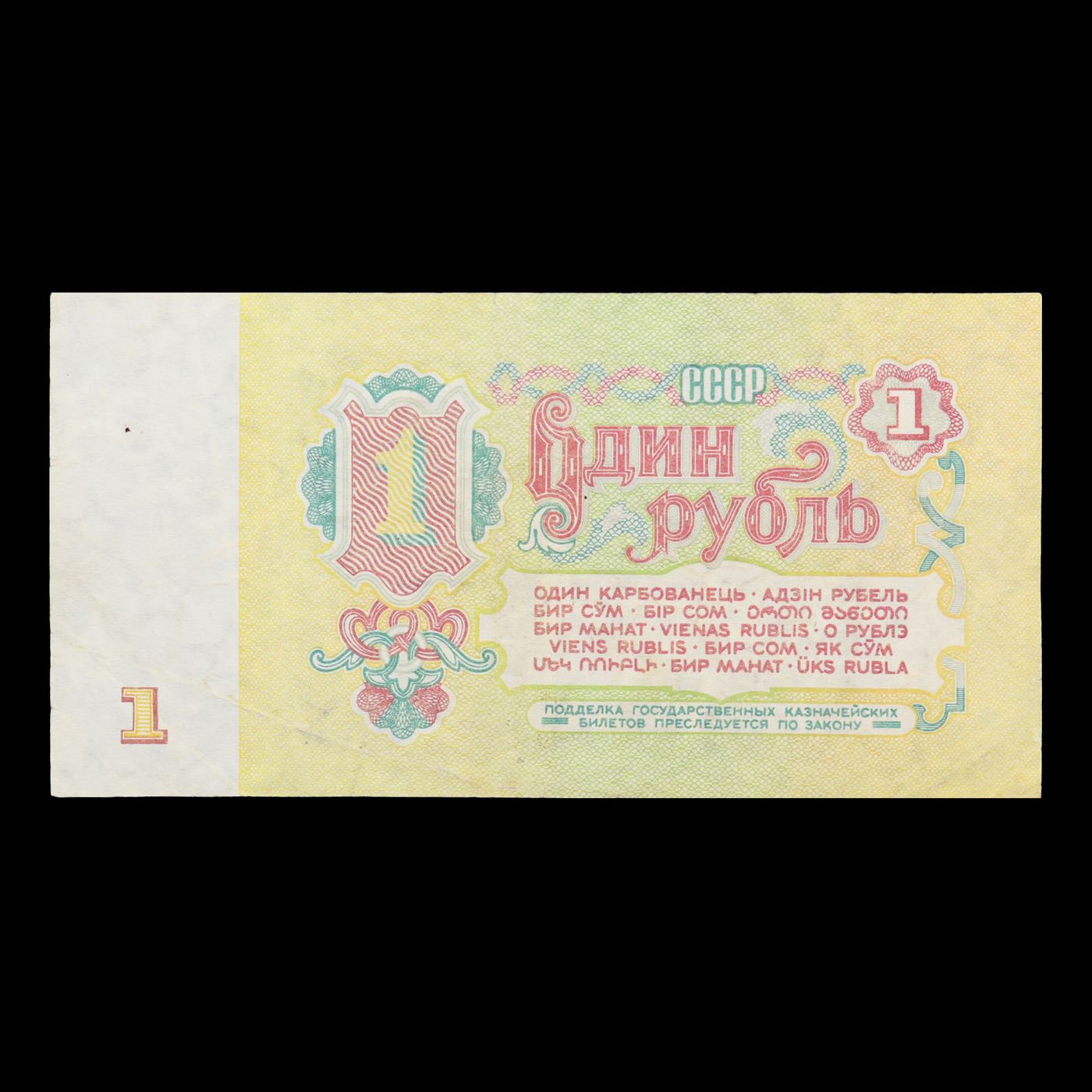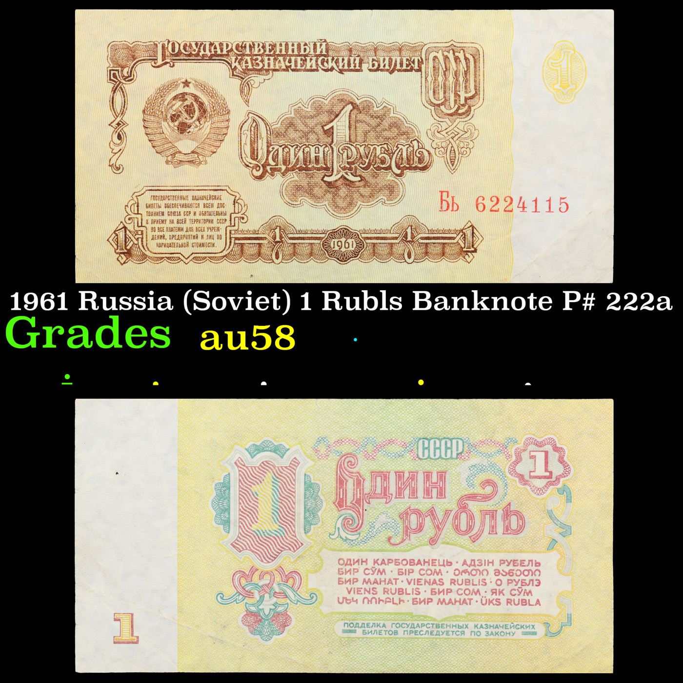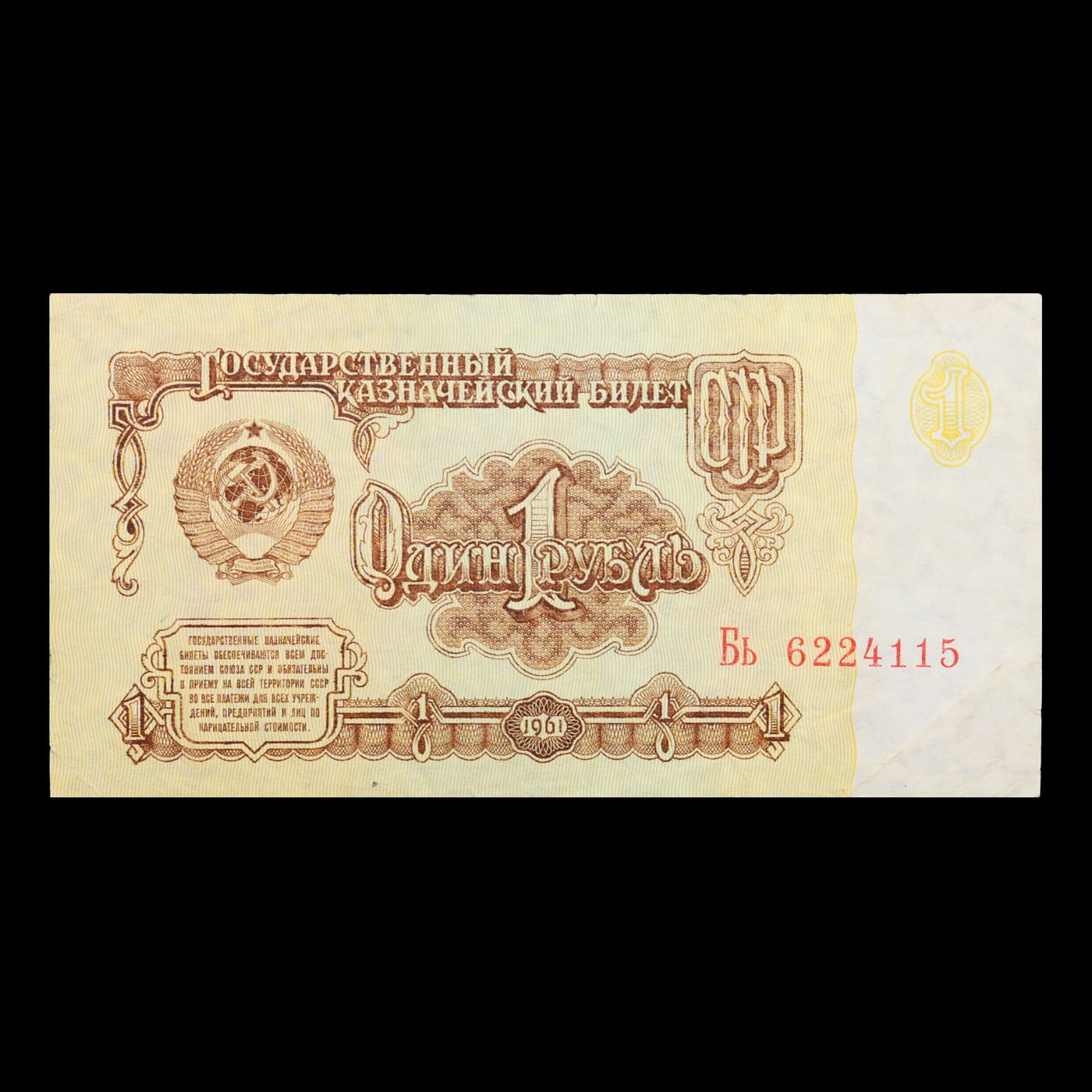 1961 Russia (Soviet) 1 Rubls Banknote P# 222a Grades Choice AU/BU Slider. The "Sixth Soviet Ruble" was issued first in 1961, and the designs for both the non-commemorative coins and paper currency of the Soviet Union almost remained identical from 1961 nearly until the fall of the Soviet Union in 1991. Briefly before the Soviet Union fell, there was the monetary reform of 1991 and the release of the Seventh Soviet Ruble, with designs that were fairly similar to the 1961 Rubles. Interestingly, the 500 Ruble note only existed for 2 days before the collapse of the Soviet Union, and the 1000 Soviet Ruble note only came into existence 3 months after the collapse of the Soviet Union. Some Soviet banknotes were printed and remained in use in various ex-Soviet states in 1992-1993, still utilizing the 1991 Soviet designs.