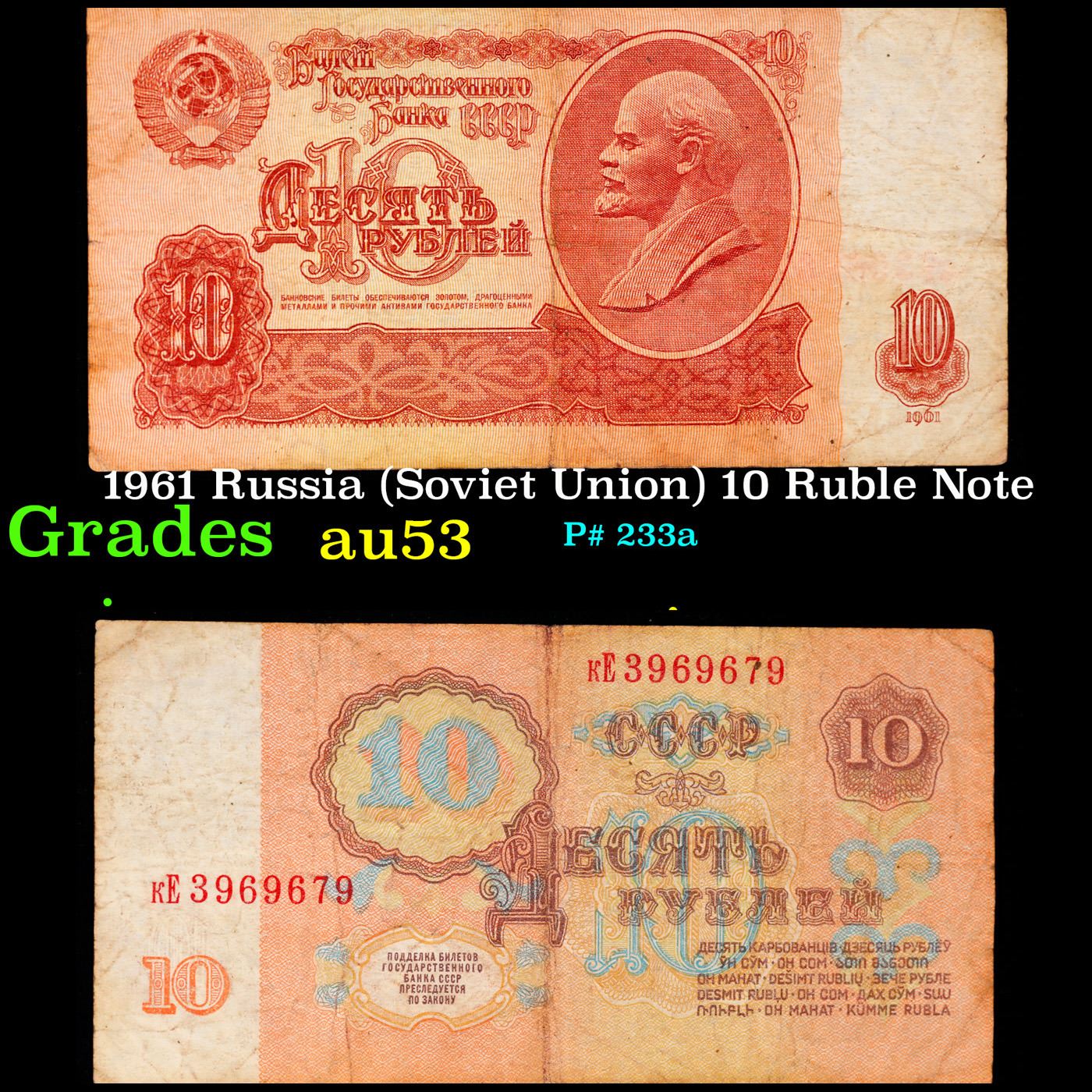 1961 Russia (Soviet Union) 10 Ruble Note Grades Select AU. The "Sixth Soviet Ruble" was issued first in 1961, and the designs for both the non-commemorative coins and paper currency of the Soviet Union almost remained identical from 1961 nearly until the fall of the Soviet Union in 1991. Briefly before the Soviet Union fell, there was the monetary reform of 1991 and the release of the Seventh Soviet Ruble, with designs that were fairly similar to the 1961 Rubles. Interestingly, the 500 Ruble note only existed for 2 days before the collapse of the Soviet Union, and the 1000 Soviet Ruble note only came into existence 3 months after the collapse of the Soviet Union. Some Soviet banknotes were printed and remained in use in various ex-Soviet states in 1992-1993, still utilizing the 1991 Soviet designs.