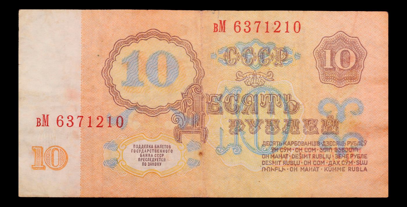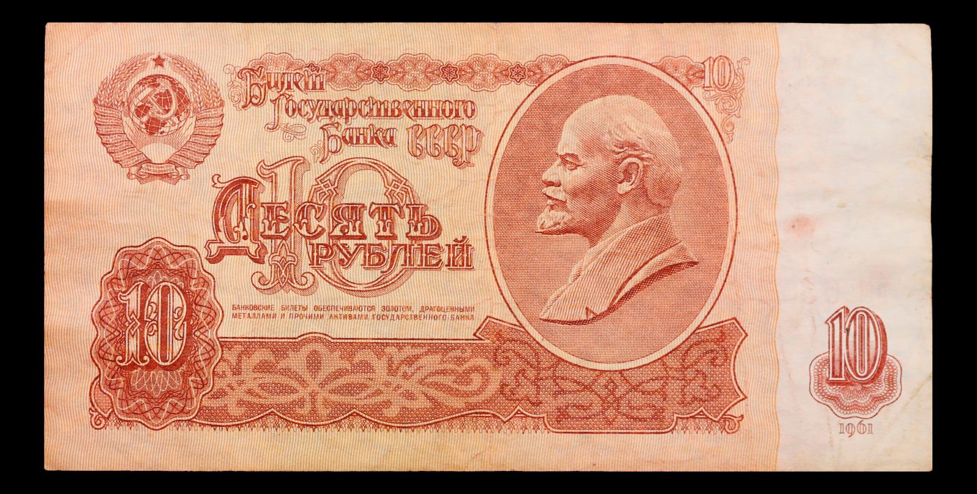 1961 Russia (Soviet Union) 10 Ruble Note P# 233a Grades vf++. The "Sixth Soviet Ruble" was issued first in 1961, and the designs for both the non-commemorative coins and paper currency of the Soviet Union almost remained identical from 1961 nearly until the fall of the Soviet Union in 1991. Briefly before the Soviet Union fell, there was the monetary reform of 1991 and the release of the Seventh Soviet Ruble, with designs that were fairly similar to the 1961 Rubles. Interestingly, the 500 Ruble note only existed for 2 days before the collapse of the Soviet Union, and the 1000 Soviet Ruble note only came into existence 3 months after the collapse of the Soviet Union. Some Soviet banknotes were printed and remained in use in various ex-Soviet states in 1992-1993, still utilizing the 1991 Soviet designs.