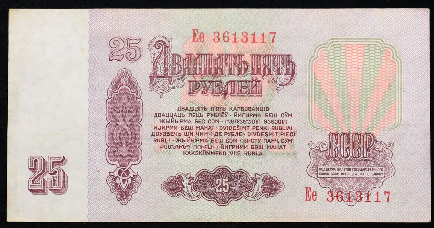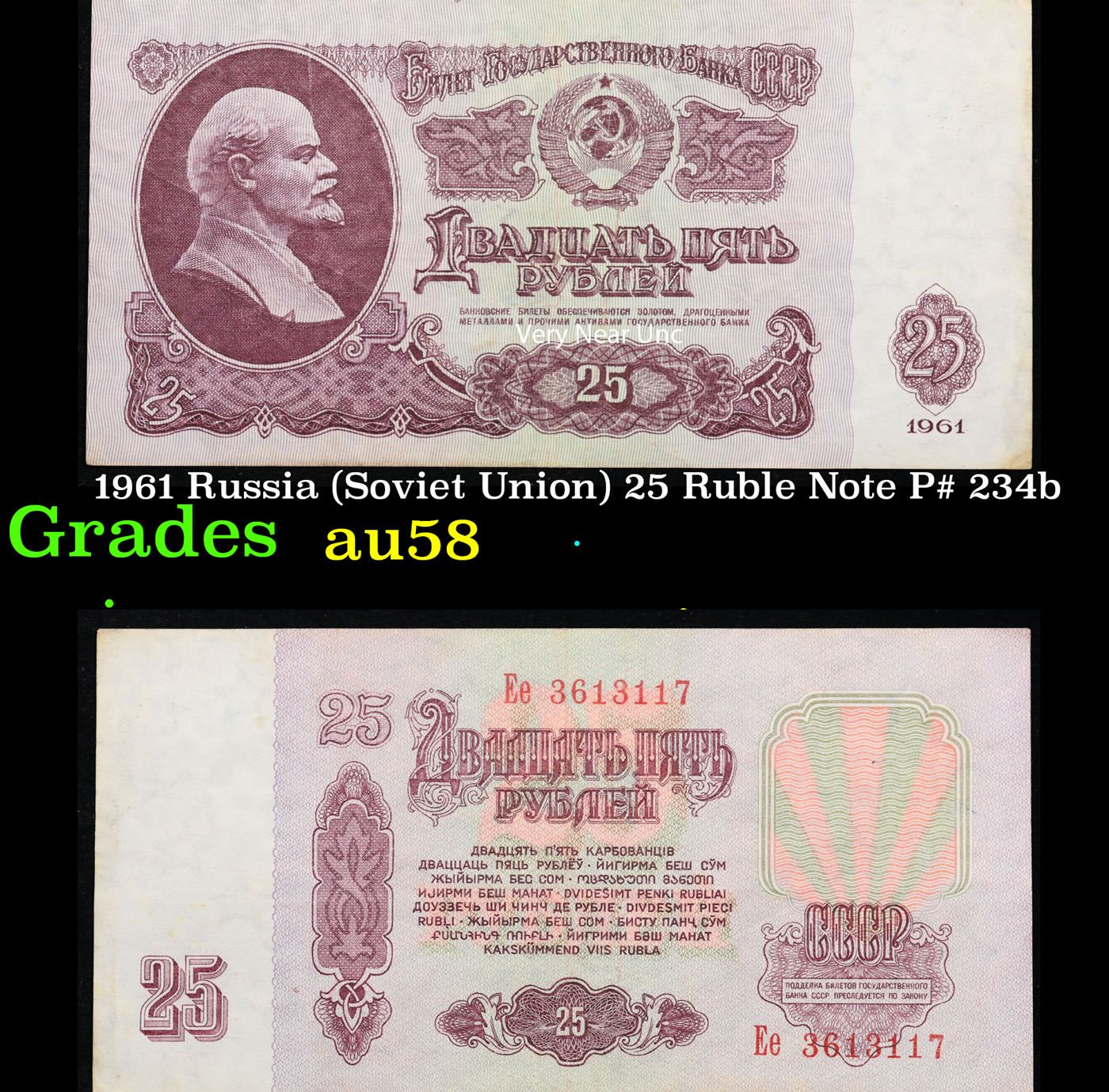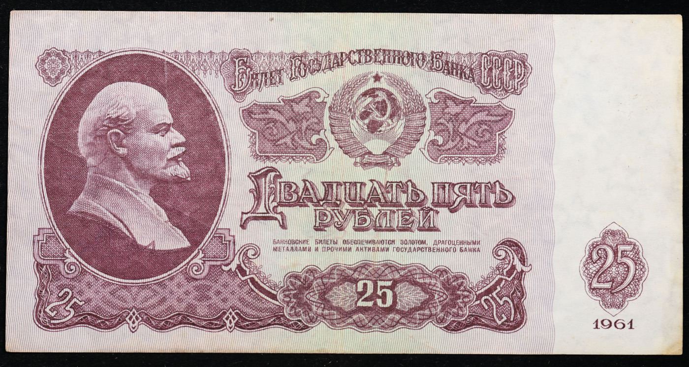 1961 Russia (Soviet Union) 25 Ruble Note P# 234b Grades Choice AU/BU Slider. The "Sixth Soviet Ruble" was issued first in 1961, and the designs for both the non-commemorative coins and paper currency of the Soviet Union almost remained identical from 1961 nearly until the fall of the Soviet Union in 1991. Briefly before the Soviet Union fell, there was the monetary reform of 1991 and the release of the Seventh Soviet Ruble, with designs that were fairly similar to the 1961 Rubles. Interestingly, the 500 Ruble note only existed for 2 days before the collapse of the Soviet Union, and the 1000 Soviet Ruble note only came into existence 3 months after the collapse of the Soviet Union. Some Soviet banknotes were printed and remained in use in various ex-Soviet states in 1992-1993, still utilizing the 1991 Soviet designs.