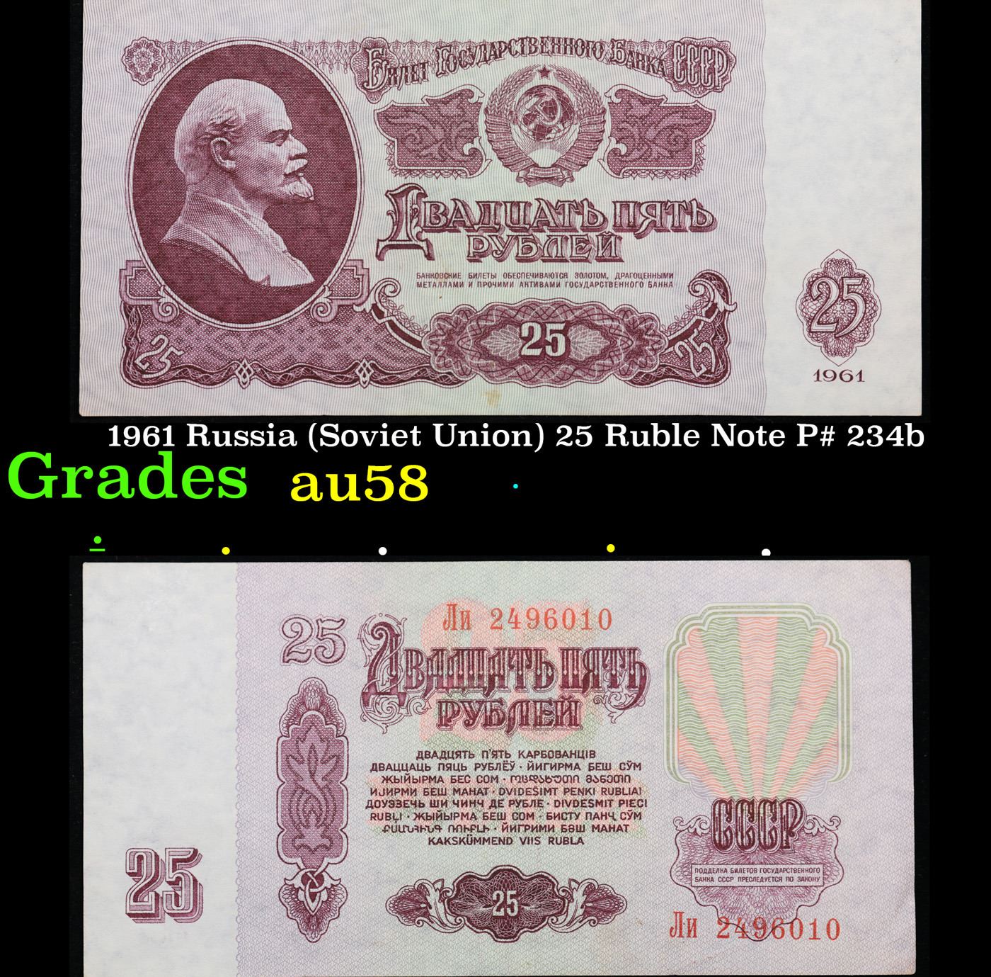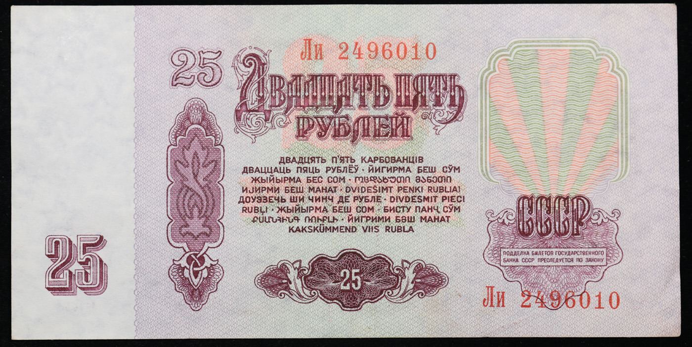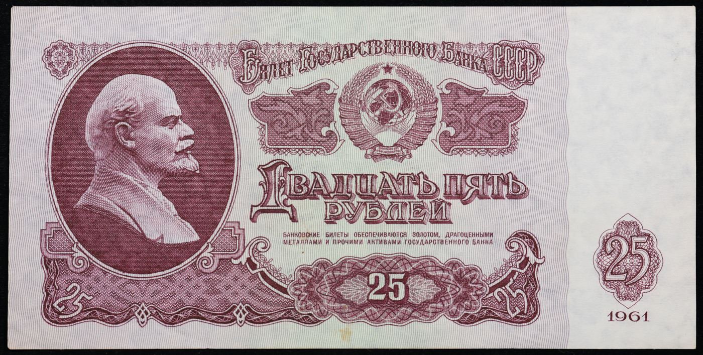 1961 Russia (Soviet Union) 25 Ruble Note P# 234b Grades Choice AU/BU Slider. The "Sixth Soviet Ruble" was issued first in 1961, and the designs for both the non-commemorative coins and paper currency of the Soviet Union almost remained identical from 1961 nearly until the fall of the Soviet Union in 1991. Briefly before the Soviet Union fell, there was the monetary reform of 1991 and the release of the Seventh Soviet Ruble, with designs that were fairly similar to the 1961 Rubles. Interestingly, the 500 Ruble note only existed for 2 days before the collapse of the Soviet Union, and the 1000 Soviet Ruble note only came into existence 3 months after the collapse of the Soviet Union. Some Soviet banknotes were printed and remained in use in various ex-Soviet states in 1992-1993, still utilizing the 1991 Soviet designs.