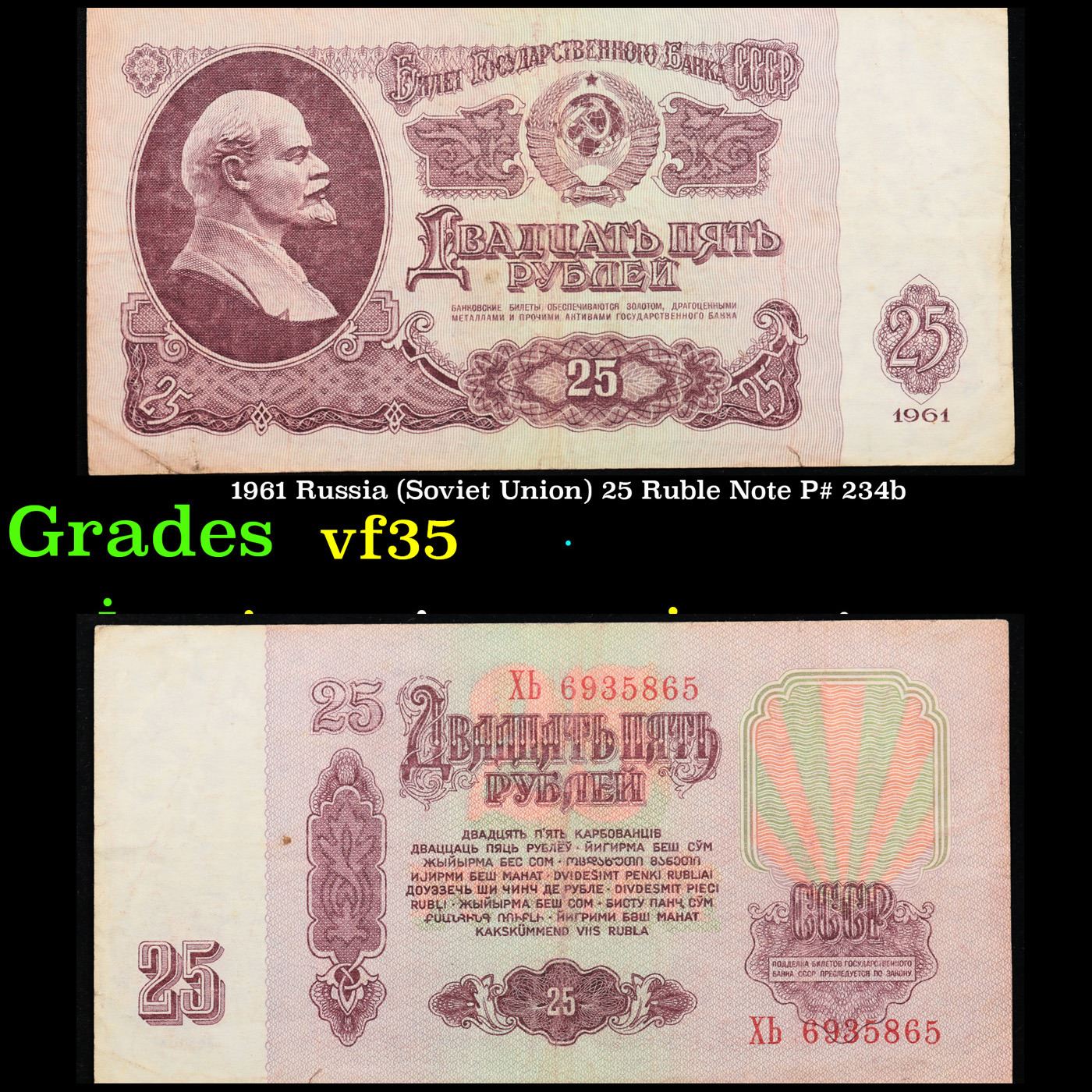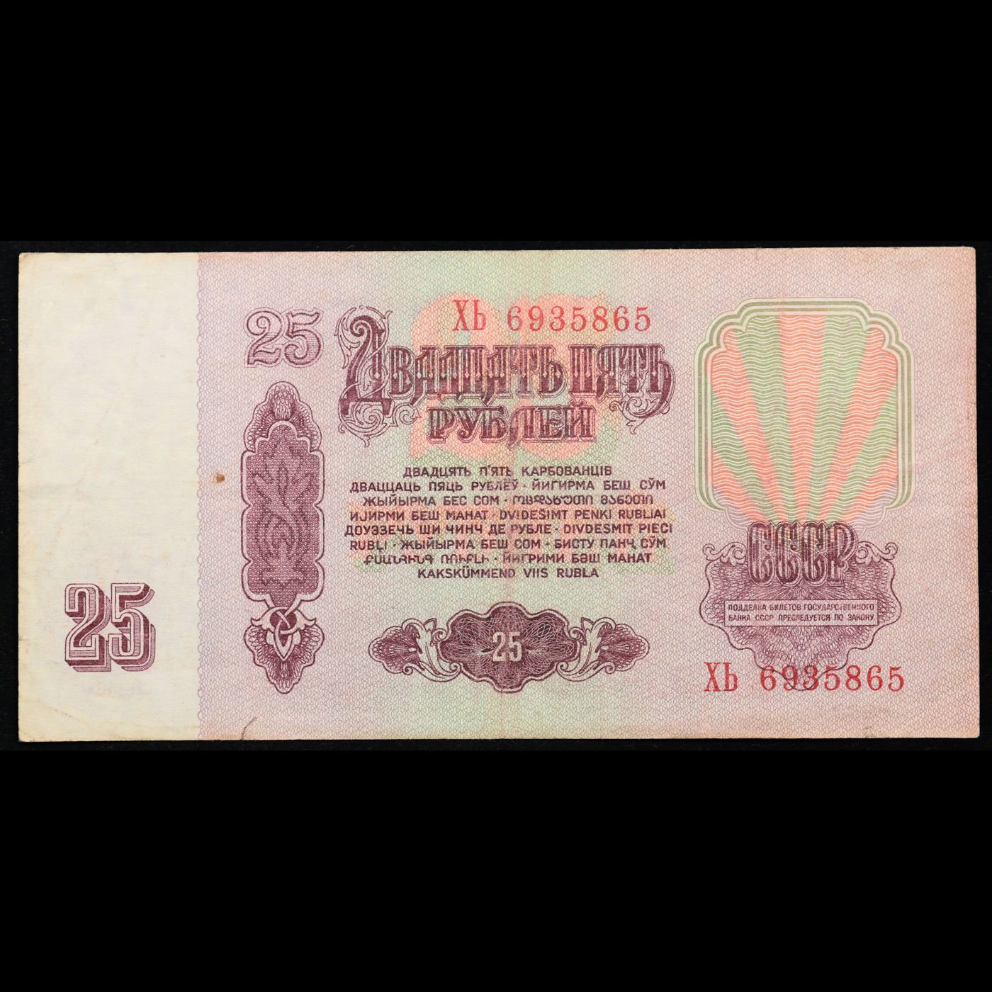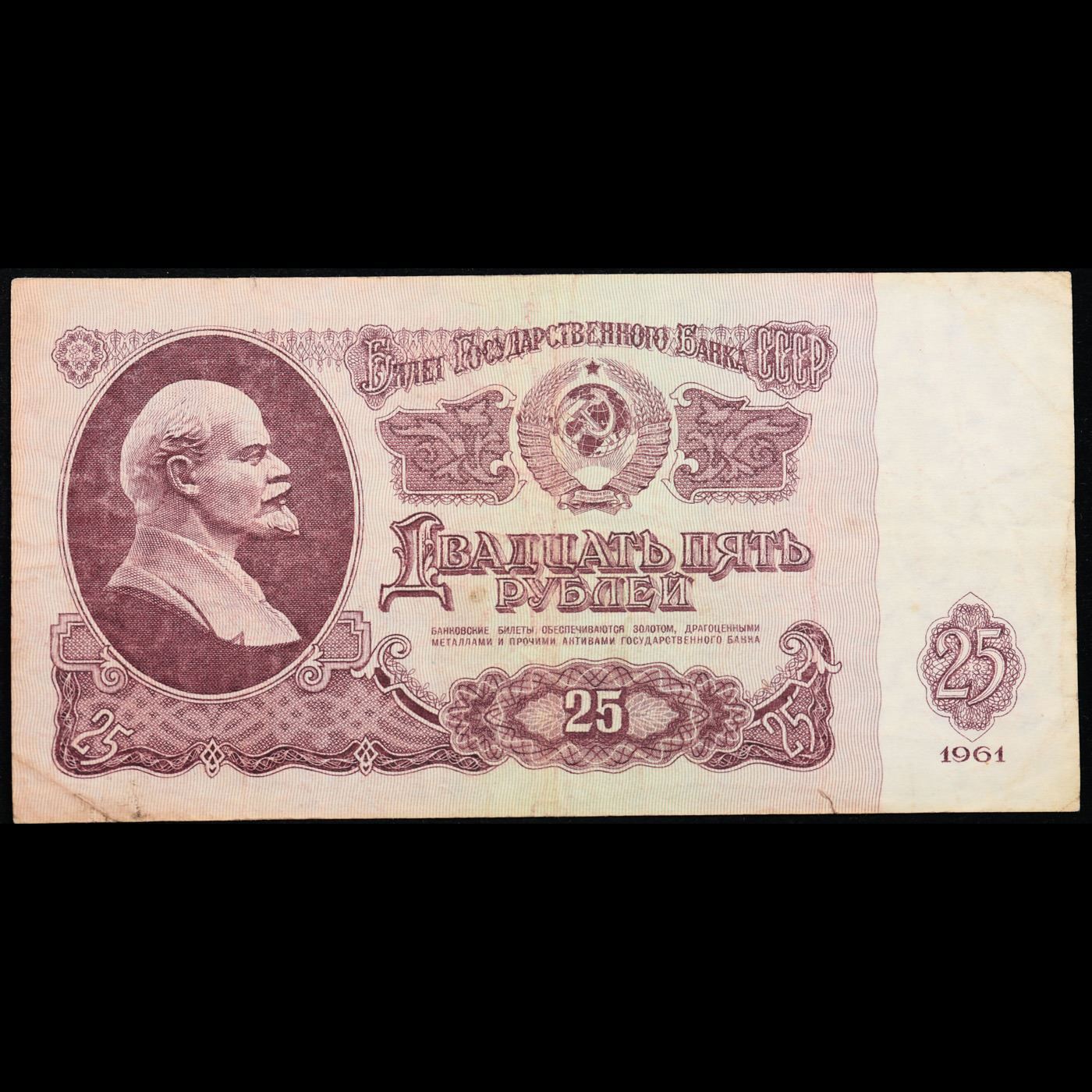 1961 Russia (Soviet Union) 25 Ruble Note P# 234b Grades vf++. The "Sixth Soviet Ruble" was issued first in 1961, and the designs for both the non-commemorative coins and paper currency of the Soviet Union almost remained identical from 1961 nearly until the fall of the Soviet Union in 1991. Briefly before the Soviet Union fell, there was the monetary reform of 1991 and the release of the Seventh Soviet Ruble, with designs that were fairly similar to the 1961 Rubles. Interestingly, the 500 Ruble note only existed for 2 days before the collapse of the Soviet Union, and the 1000 Soviet Ruble note only came into existence 3 months after the collapse of the Soviet Union. Some Soviet banknotes were printed and remained in use in various ex-Soviet states in 1992-1993, still utilizing the 1991 Soviet designs.
