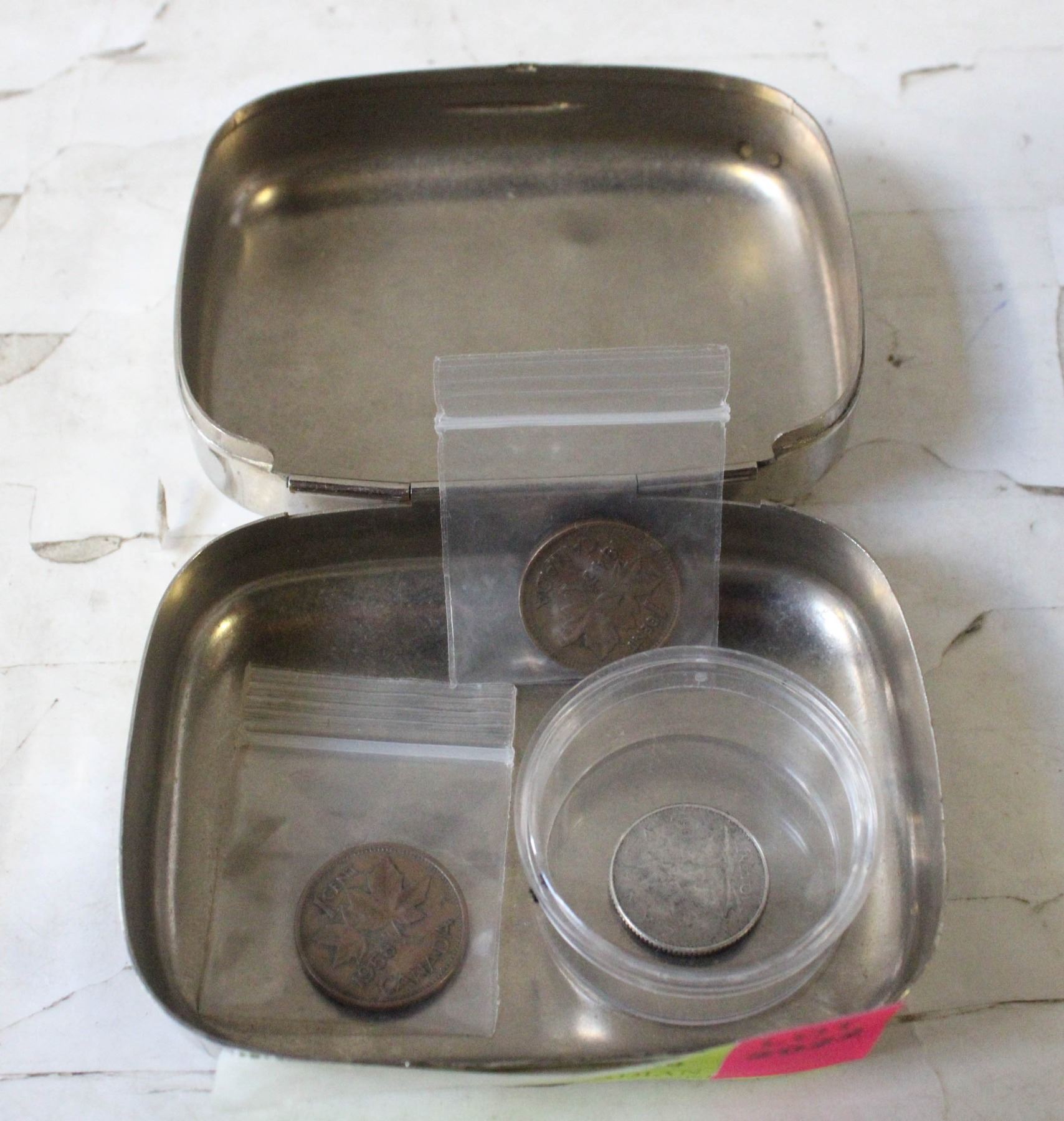 10 CENT COIN- 1945 CANADIAN KINGS PENNY - 1958 CANADIAN QUEEN PENNY ALL IN A VINTAGE STAINLESS-STEEL CHEW TOBBACO CONTAINER