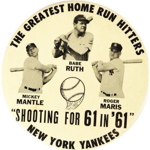 <B>1961 "Shooting for 61 in '61" Oversized Pinback.</B></I> Perhaps the most collectible pinback of the post-war era is this relic from the Yankee Stadium souvenir stands, remembering one of the most exciting seasons in the franchise's storied history. Monumentally large in both physical size (6" diameter) and visual appeal, these pins have been appearing on the auction block with decreasing frequency in recent years, with our last sale in October 2005 realizing over $2,600. This example competes with our earlier offering in quality, with mild overall toning and very light surface scratches, visible only at certain angles to the light, being the only condition issues worth noting. The verso remains in superb condition, with the cardboard backing fully intact. Those who love the Bronx Bombers will surely fall in love with a piece that celebrates the team's most prolific long ball artists. Consigned by the same gentleman who provided the exceptionally rare "61 in '61 or Bust" pinback also in this auction.