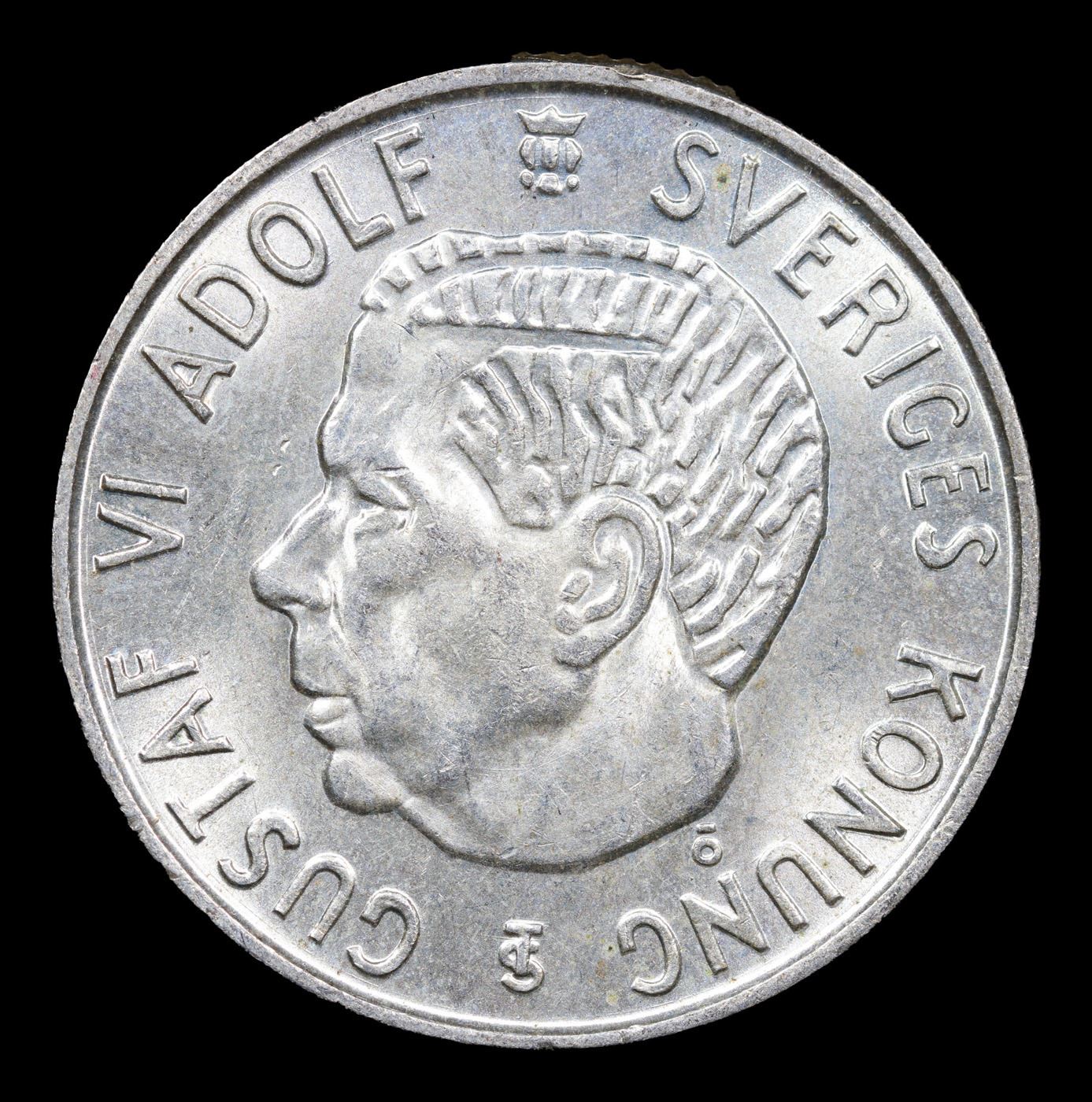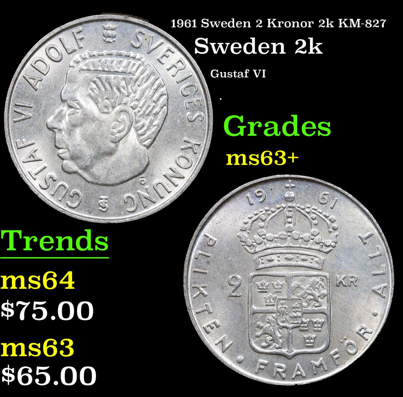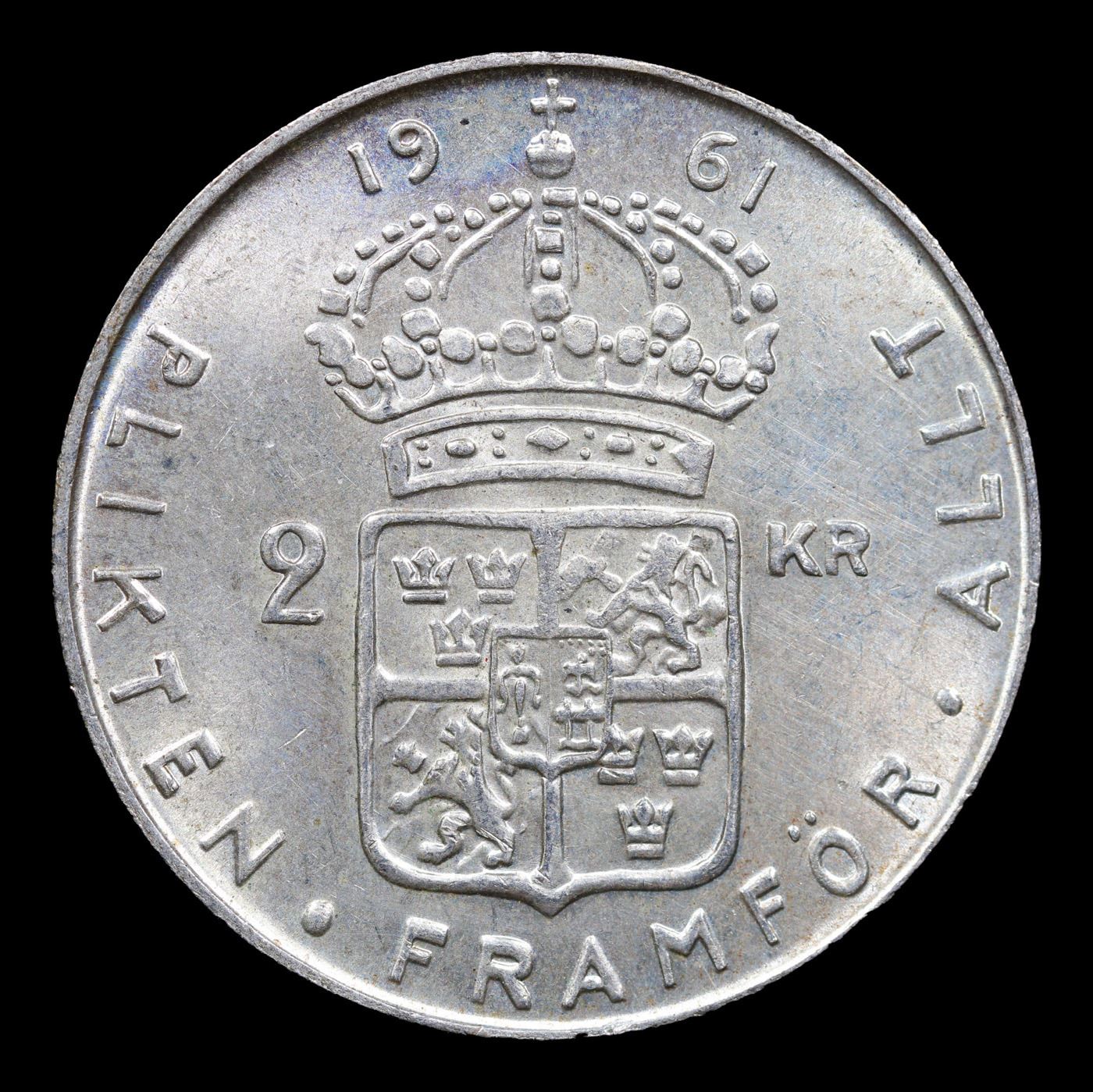 1961 Sweden 2 Kronor 2k KM-827 Grades Select+ Unc. Gustaf VI Adolf (Oscar Fredrik Wilhelm Olaf Gustaf Adolf; 11 November 1882 – 15 September 1973) was King of Sweden from 29 October 1950 until his death. The eldest son of Gustaf V and his wife, Victoria of Baden, he had been Crown Prince for the preceding 42 years in the reign of his father. Shortly before his death, he approved the constitutional changes which removed the Swedish monarchy's last nominal political powers. He was a lifelong amateur archeologist particularly interested in Ancient Italian cultures.