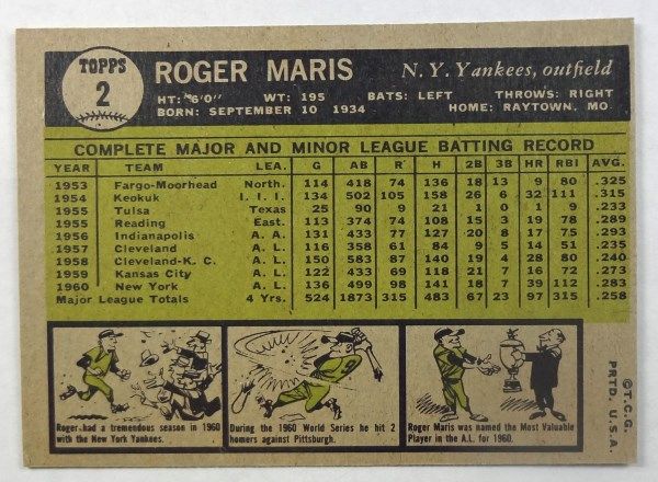 NICE ORIGINAL 1961 TOPPS ROGER MARIS, EXCELLENT ONLY SLIGHT CORNER WEAR, CENTERED 20/80