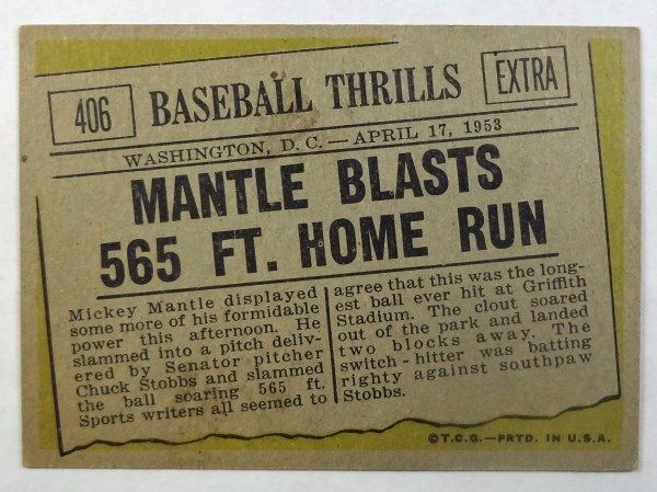 ORIGIANL 1961 TOPPS MANTLE CARD, GRADES EXCELLENT, GREAT COLOR & GLOSS