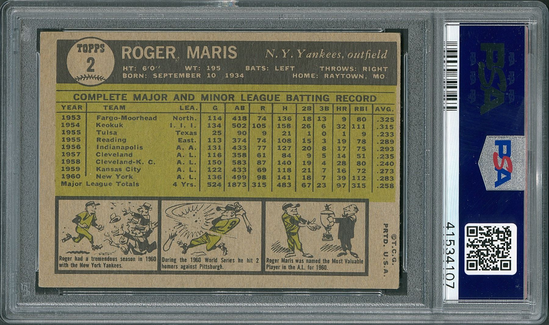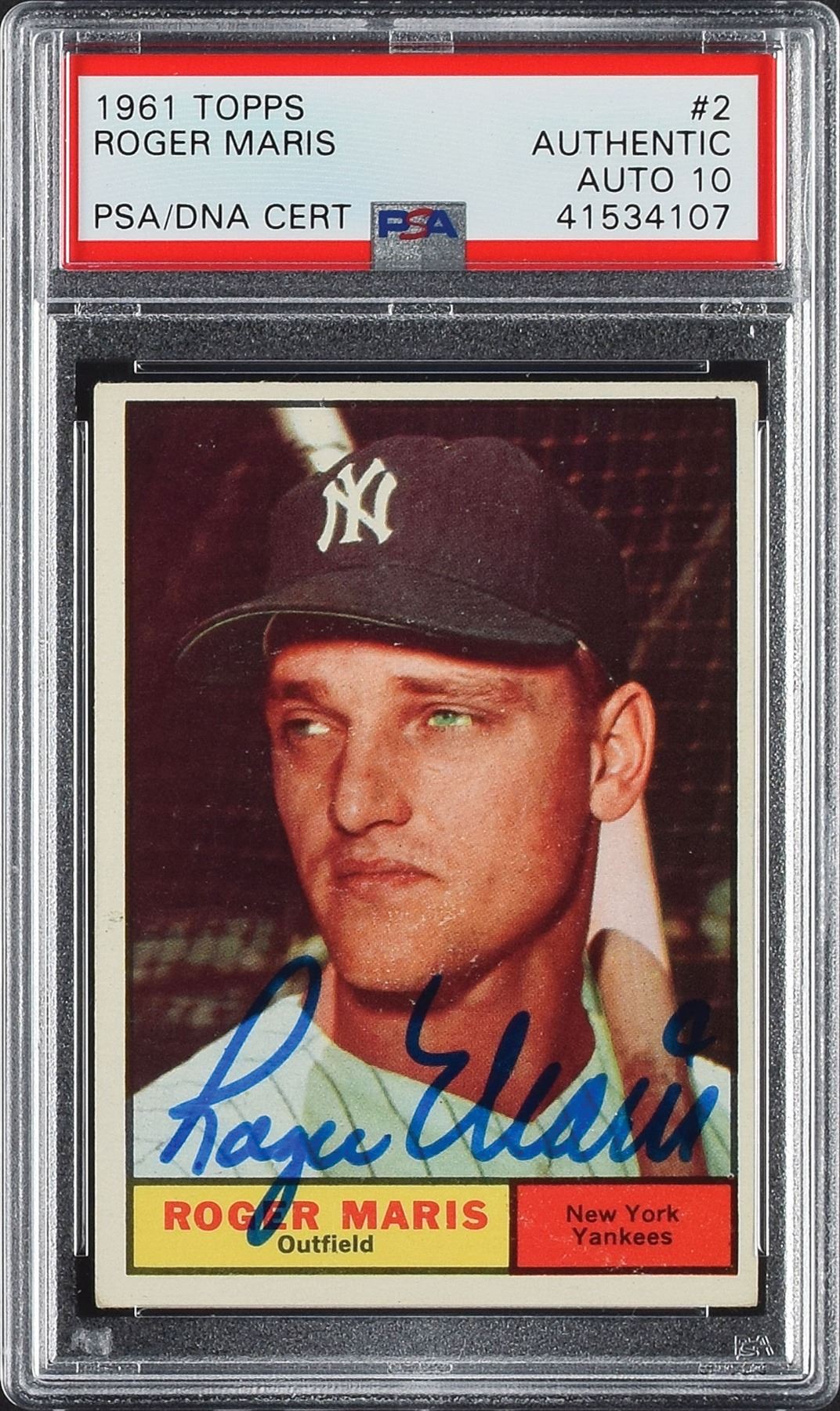 We present this 1961 Topps Roger Maris card #2 which is graced by a flawless blue felt tip PSA/DNA GEM MT 10 signature, obtained in person by the original owner decades ago. The card itself is a very well-centered example of one of Maris' most popular cards and is in EX to EX-MT condition overall. Maris' early passing (d.1985), leaves the hobby short of signatures on his most desirable baseball cards. The ultimate Roger Maris New York Yankee autographed baseball card with one of the most coveted signatures of any modern-era, non-Hall of Famer. Graded by PSA/DNA GEM MINT 10.