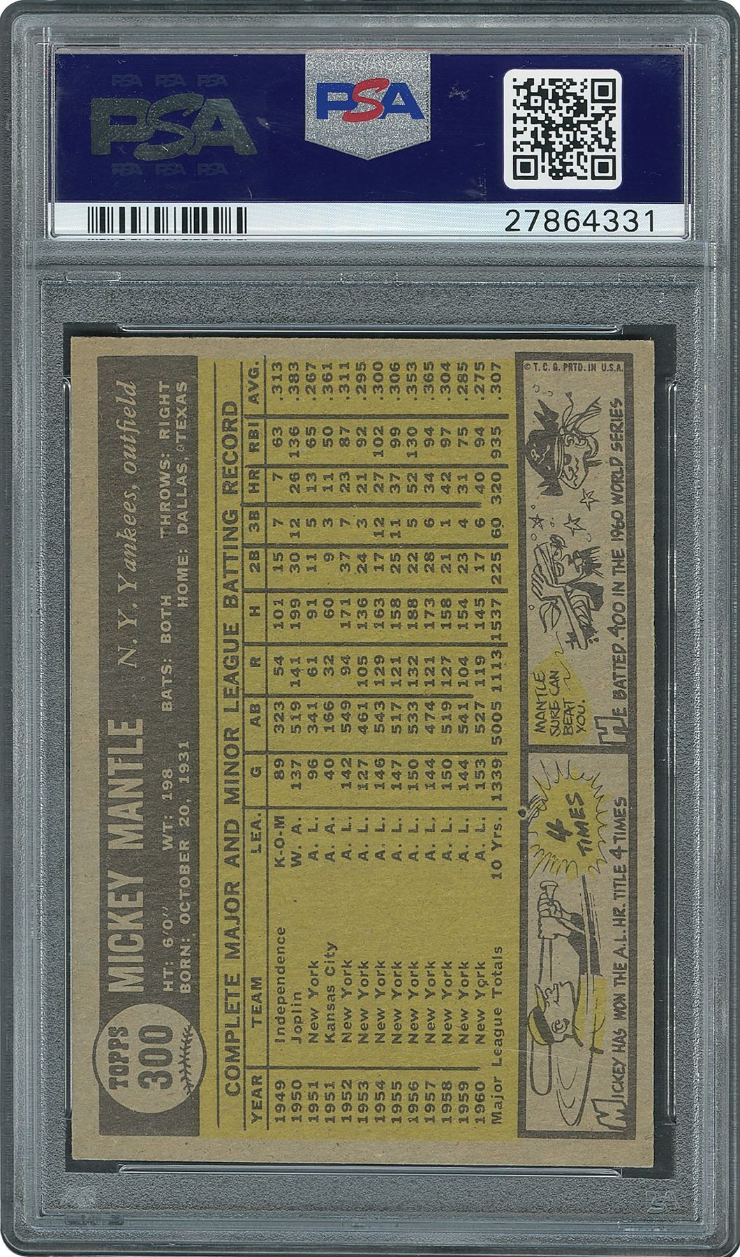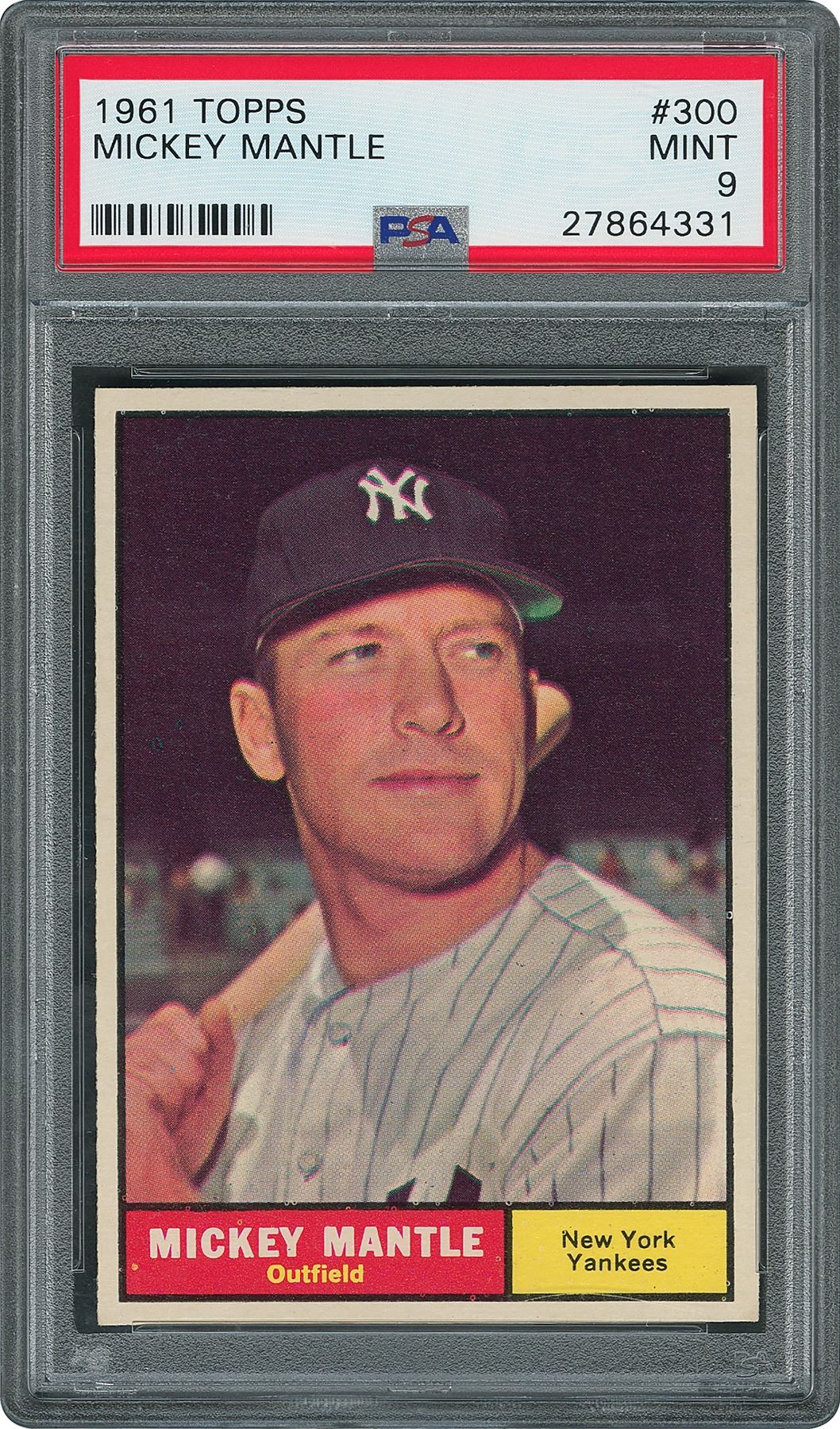 Graded by PSA MINT 9. Issued during the famous 1961 season when Mickey and Roger Maris chased Babe Ruth's single season home run record, this issue has always been one of Mantle's most popular cards. Razor sharp corners, bold color and superb centering all around. Only two examples grade higher.
