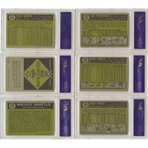 <B>1961 Topps Baseball Complete Set (587).</B></I> The 1961 Topps baseball series consists of 587 cards and includes a scarce high numbers series of cards 523-589. A total of six cards have been graded by PSA with an aggregate SMR value of $530. Graded cards - <B>PSA 6:</B></I> #344 Koufax, 425 Berra; <B>PSA 5:</B></I> #287 Yastrzemski, 300 Mantle, 472 Berra MVP, 578 Mantle AS. Ungraded cards include #2 Maris (VG), 141 B. Williams (VG), #150 Mays (G), 160 Ford (EX), 207 Koufax (EX), 290 Musial (EX), 388 Clemente (VG/EX), 415 Aaron (VG), 417 Marichal (G), 440 Aparicio (EX/MT), 460 Hodges (EX), 580 Kaline (EX/MT). Set grades 13% NM, 55% EX to EX/MT, 32% VG to VG/EX (some lesser).
