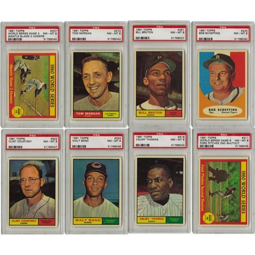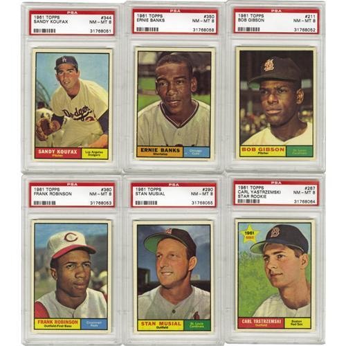 <B>1961 Topps Baseball PSA NM-MT 8 Lot of 14.</B></I> Solid assortment of top-quality cards was pulled from an untouched vending case and sent right off for slabbing. Terrific break down value here, with list of offerings as follows: Bob Gibson #211, Bob Scheffing #223, Bill Bruton #251, Tom Morgan #272, Carl Yastrzemski Star Rookie #287, Stan Musial #290, 1961 Topps World Series Game 2 #307, 1961 Topps World Series Game 6 #311, Valmy Thomas #319, Walt Bond #334, Clint Courtney #342, Sandy Koufax #344, Ernie Banks #350, Frank Robinson #360. SMR value $1100.<BR><BR><b>Shipping:</b> Sportscard (<a target="_blank" href="http://www.heritageauctions.com/common/shipping.php">view shipping information</a>)