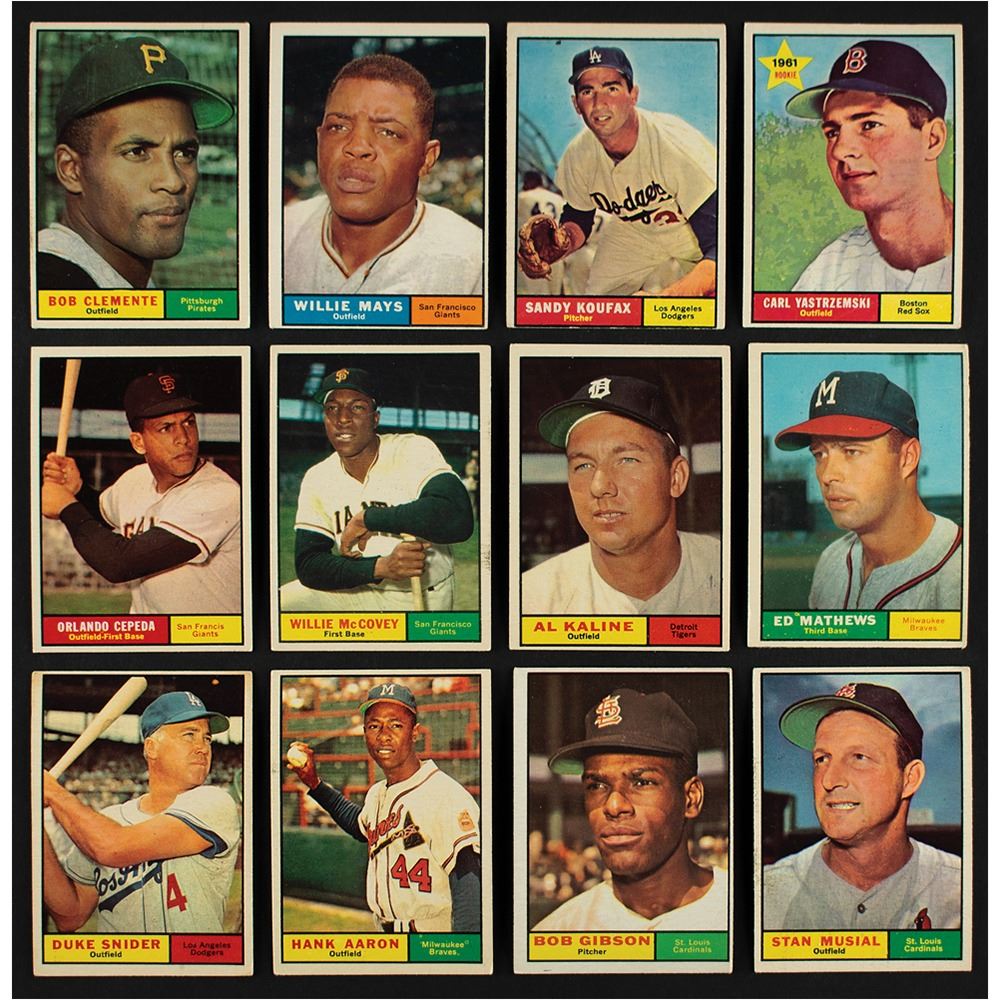 Partial set (400/587) of 1961 Topps baseball cards, including: #150 Willie Mays (VG-EX MK), #211 Bob Gibson (VG-EX MK), #287 Carl Yastrzemski (P), #290 Stan Musial (EX MK), #344 Sandy Koufax (VG MK), #350 Ernie Banks (VG-EX MK), #388 Roberto Clemente (EX), #415 Hank Aaron (VG MK), #429 Al Kaline (VG-EX MK), #443 Duke Snider (VG-EX MK), and #517 McCovey (EX MK). Overall set grades 10% EX-MT, 40% EX, 30% VG-EX, 20% lesser, most with small ballpoint annotations on the backs (denoted as MK in the above list).