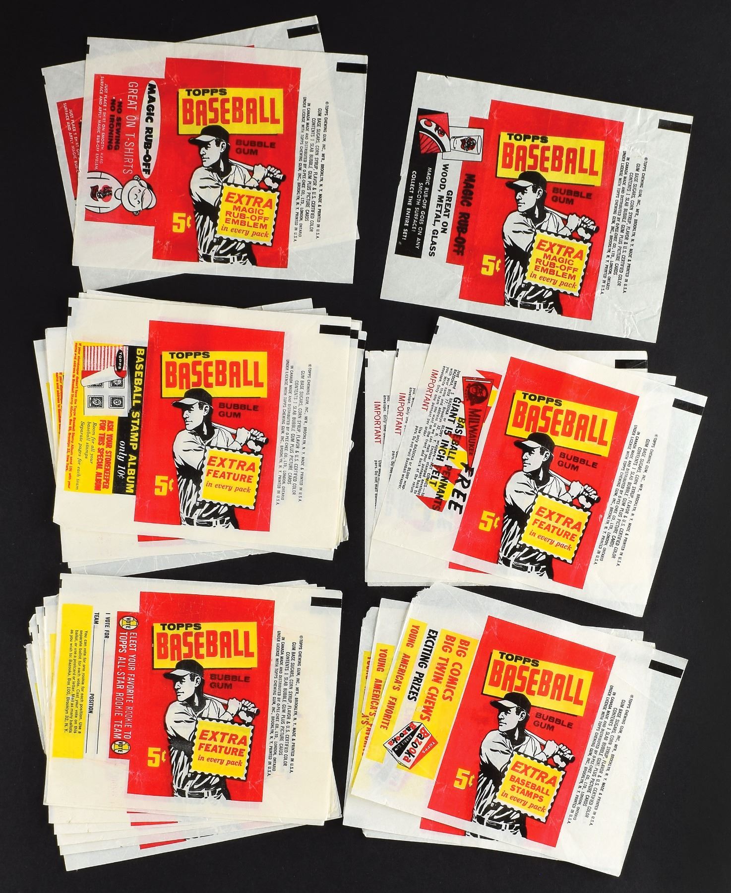 Total of 24 wrappers with six different panel/ad varieties. Most are in excellent overall condition with usual folds while some have light tears and/or small holes. Includes: Magic rub off T shirt (2), Magic rub off (1), Free pennants (4), Stamp album (7 – one FAIR), Comics (3) and Rookie voting (7). Total of 24 wrappers, mostly excellent.