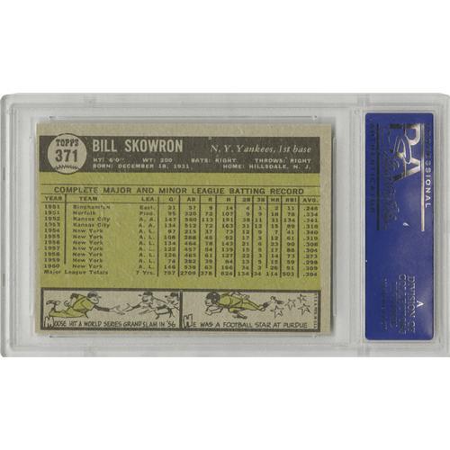 <B>1961 Topps Bill Skowron #371 PSA Mint 9.</B></I> The best Moose in the world! Check the population charts and you'll see that our offering has never been topped. Perfect color, gloss and registration give this one unbeatable visual appeal. And what a year to be a Yankee! <BR><BR><B>Important notice:</B> Heritage usually auctions material at the rate of 200-250 lots per hour. On some occasions eBay Live bid software or the Internet may not be able to keep up with the pace of the auction. We recommend placing a realistic absentee bid now as insurance to avoid disappointment. Occasionally the auctioneer may eliminate or reject an eBay Live bid, and the auctioneer may also reopen a lot after the close of the eBay live bidding (usually because we missed an audience bid), and may reject your bid even if it shows you as the winning bidder. By bidding via eBay Live, you agree that Heritage may award the lot to another bidder at its sole discretion under the circumstances described above or any other reasonable circumstances. Since eBay bids are not shown to us until we open the lot on the floor, we treat those bids just like floor bids. In most cases the floor responds before the eBay bid is presented to us, due to Internet lag time, so for consistency we have made it a policy that floor bids are always considered first over tie eBay live bids. Also please note that all Heritage lots purchased through eBay Live carry a 22.5% Buyer's Premium. Please make sure you read the Terms and Conditions before you bid. This lot is being auctioned in conjunction with a live floor auction by Heritage Galleries & Auctioneers. All final auction and invoice information will be supplied by Heritage Galleries & Auctioneers, and all other information should be considered preliminary. Lot:19592 <BR><BR><B>Winning Notification and Billing:</B> After the FINAL session in this auction is complete, Heritage will send e-mail and snail mail invoices. This process normally takes several days. All final auction and invoice information will be supplied by Heritage Galleries & Auctioneers, and all other information should be considered preliminary. <BR><BR>This auction will be conducted on a live auction floor and over the Internet through eBay Live. If you choose to place an absentee bid, please take a moment to <font color='#0000ff'><u><a href='http://pages.ebay.com/liveauctions/help/before/laabsentee.html'>learn how eBay Live absentee bidding works</a></u></font><font color='#000000'>